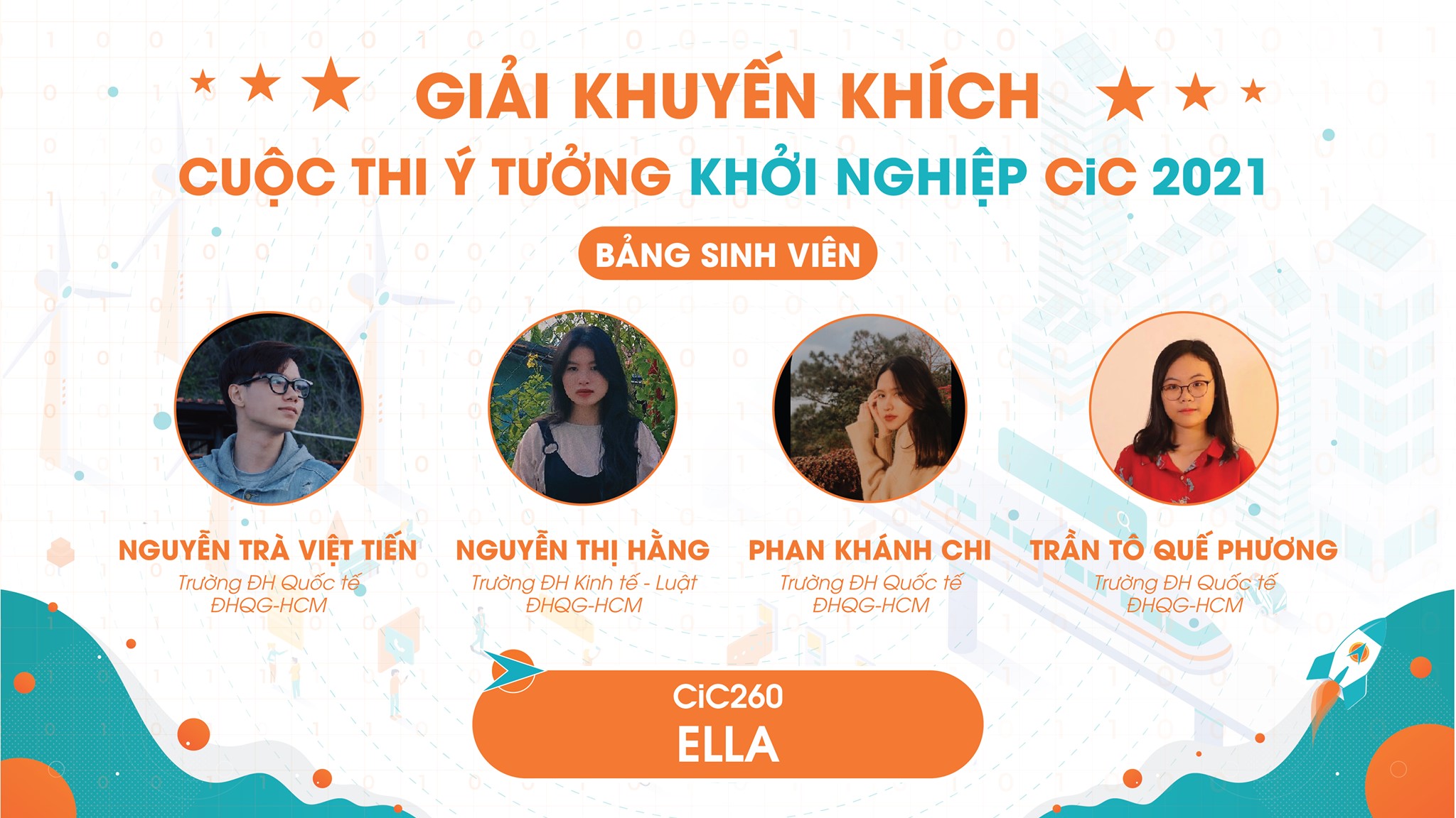 Ngày 31/10/2021, cuộc thi “Ý tưởng khởi nghiệp – CiC 2021đã diễn ra Vòng Chung kết vô cùng gây cấn bằng hình thức trực tuyến. Kết quả chung cuộc, trường ĐHQT ghi dấu ấn với 1 giải Khuyến khích và 1 giải Ba thuộc về dự án ELLA và WORLD GIVING LOVE.