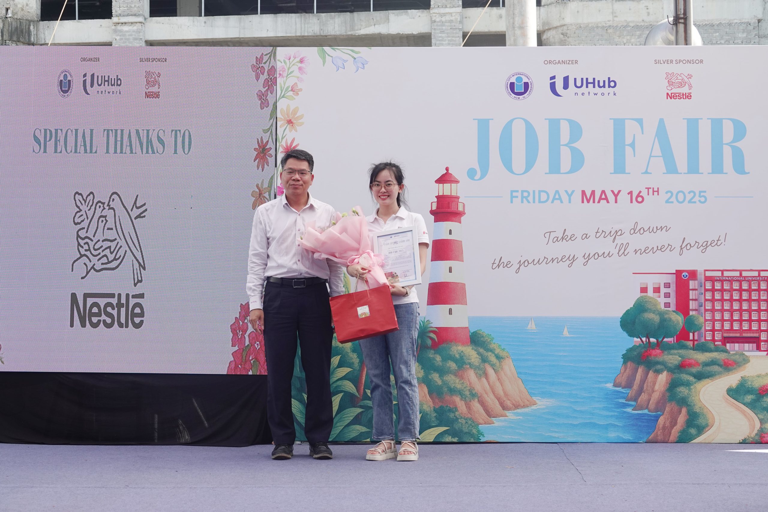 PGS. TS. Lê Văn Thăng tặng hoa và kỷ niệm chương đến bà Nguyễn Quỳnh Như – Quản lý tuyển dụng khối Thương mại Nestle Vietnam – Nhà tài trợ bạc của Ngày hội.