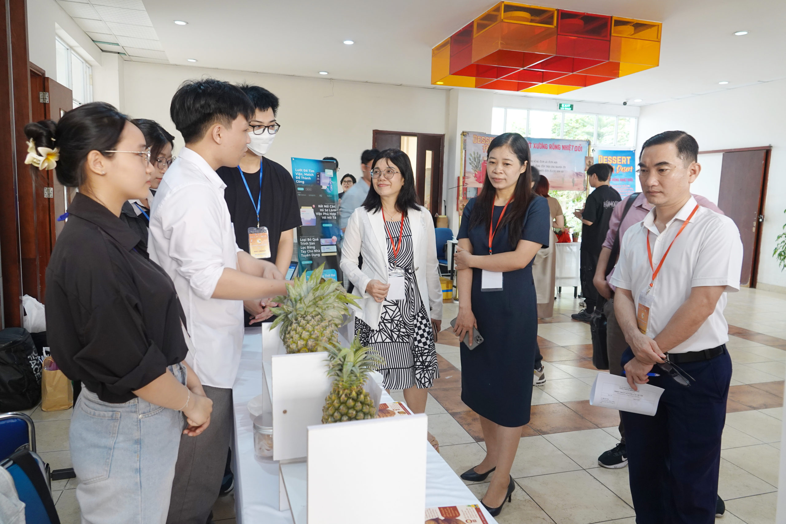 Dự án: Mứt xương rồng không đường kết hợp cùng thanh long và chanh dây – đang được người tham gia thưởng thức sản phẩm tại gian hàng.