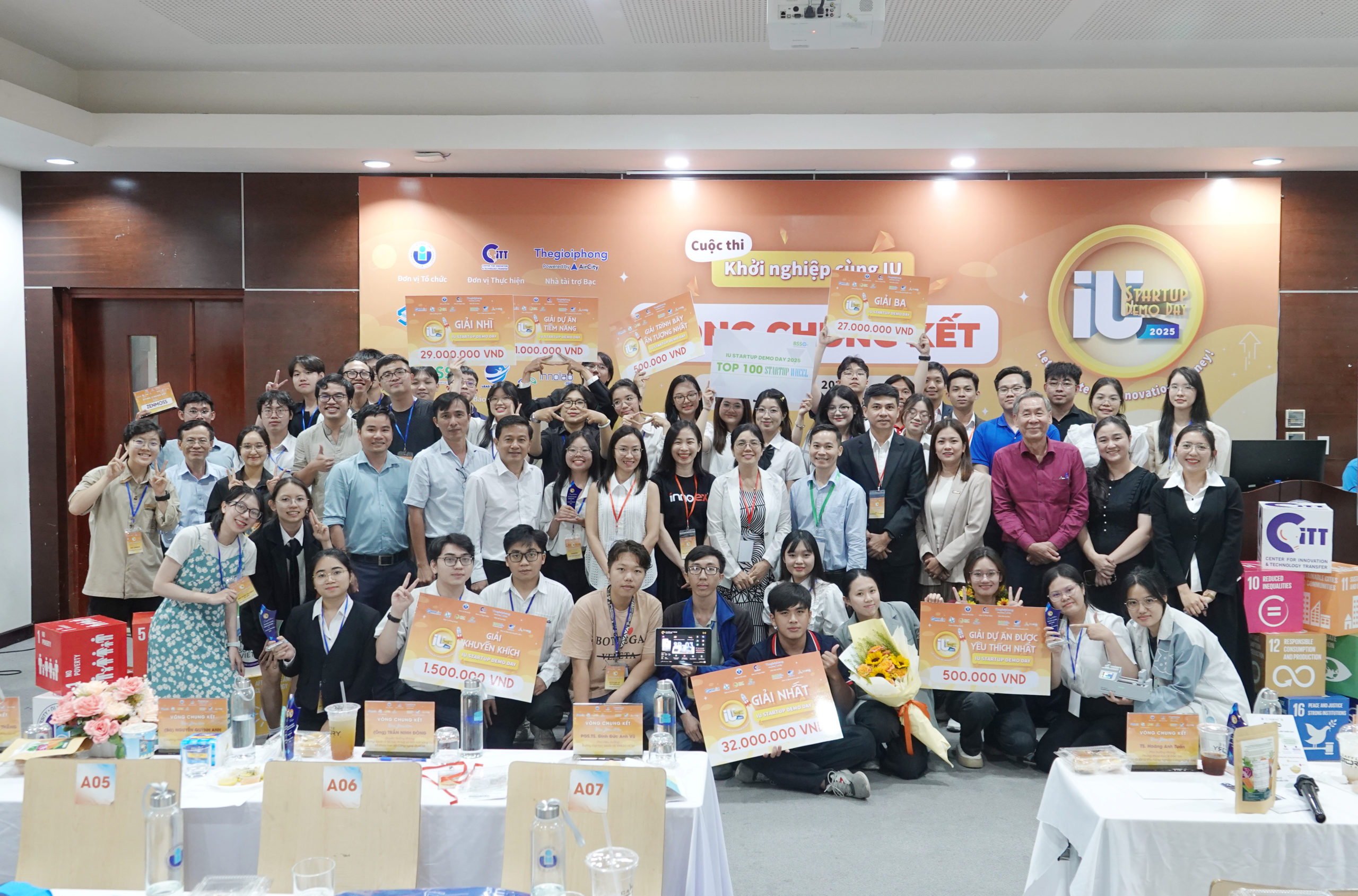 Ban tổ chức chụp hình lưu niệm cùng các đội thi IU Startup Demo Day 2025.