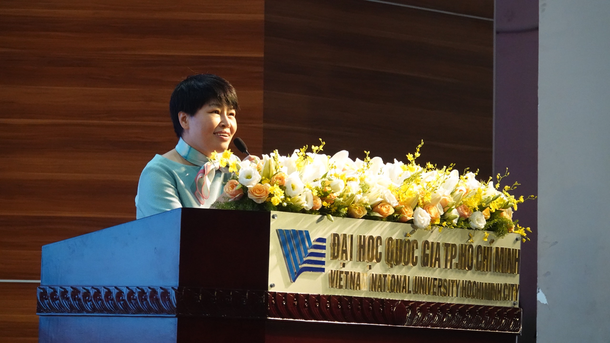 Bà Nguyễn Thị Vui – Tổng Giám đốc Công ty Cổ phần Đầu tư Thái Bình – Thai Binh Shoes – đại diện doanh nghiệp tới dự và chia sẻ với các bạn Tốt nghiệp năm 2021 của trường ĐHQT sáng 12/3/2022