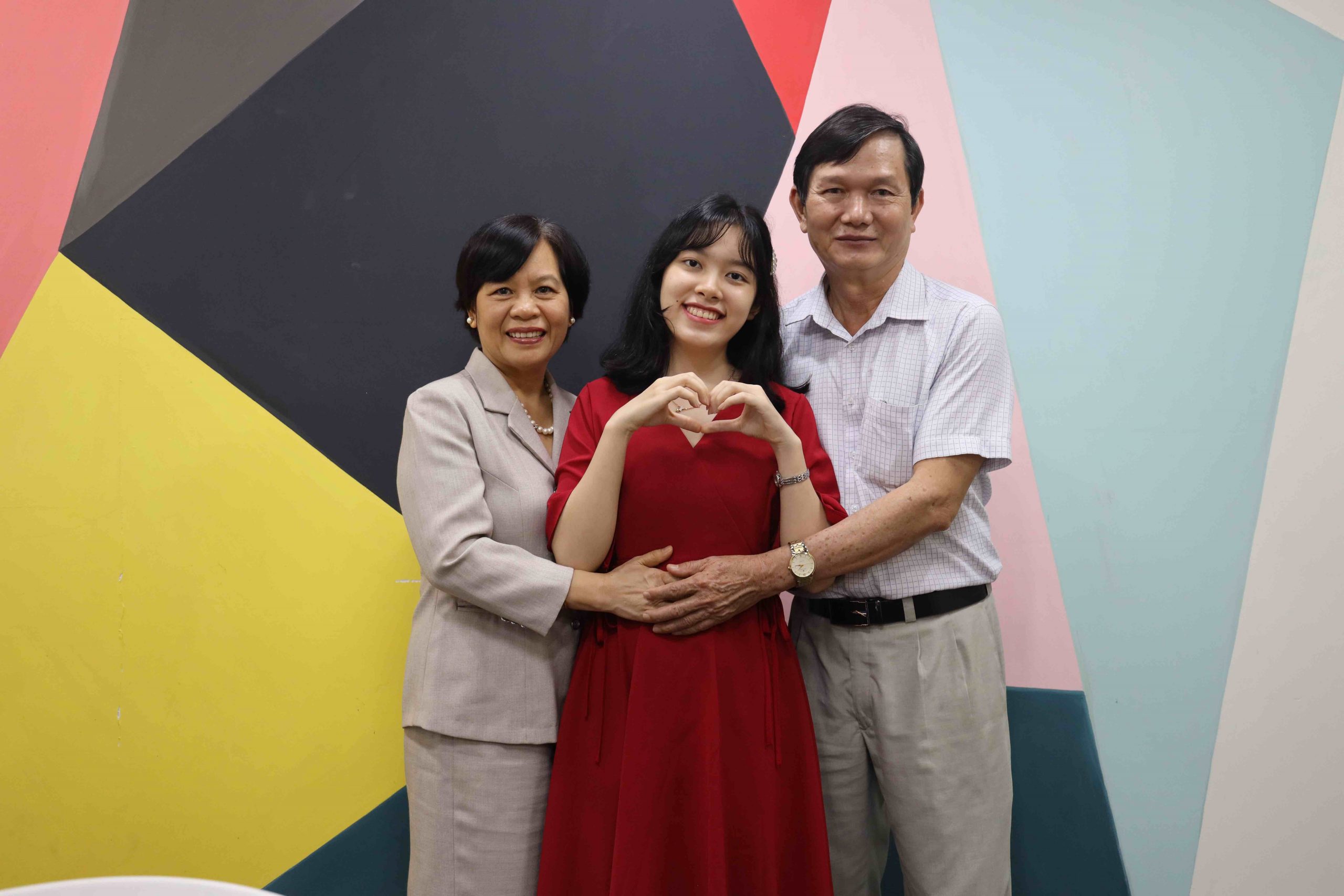 Tân Thủ Khoa Huỳnh Thị Mỹ Anh hạnh phúc bên ba mẹ của mình (cô Ngọc Ánh và chú Huỳnh Văn Mao)