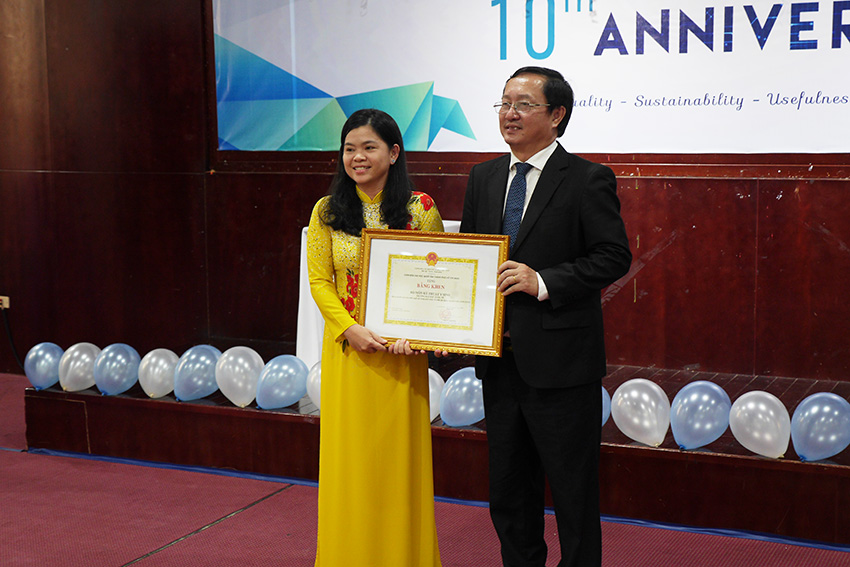 TS. Nguyễn Thị Hiệp – Trưởng Bộ môn Kỹ thuật Y sinh – đại diện Bộ môn nhận bằng khen của ĐHQG-HCM được trao từ PGS.TS. Huỳnh Thành Đạt – Giám đốc ĐHQG-HCM.