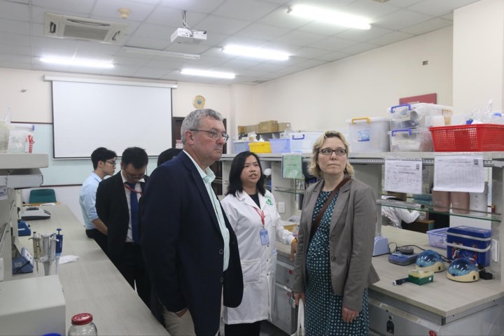 TS. Trần Thị Hải Yến (giữa) cùng GS.TS Veronika Hellwig (phải) tham quan cơ sở vật chất, hệ thống phòng thí nghiệm Khoa CNSH.
