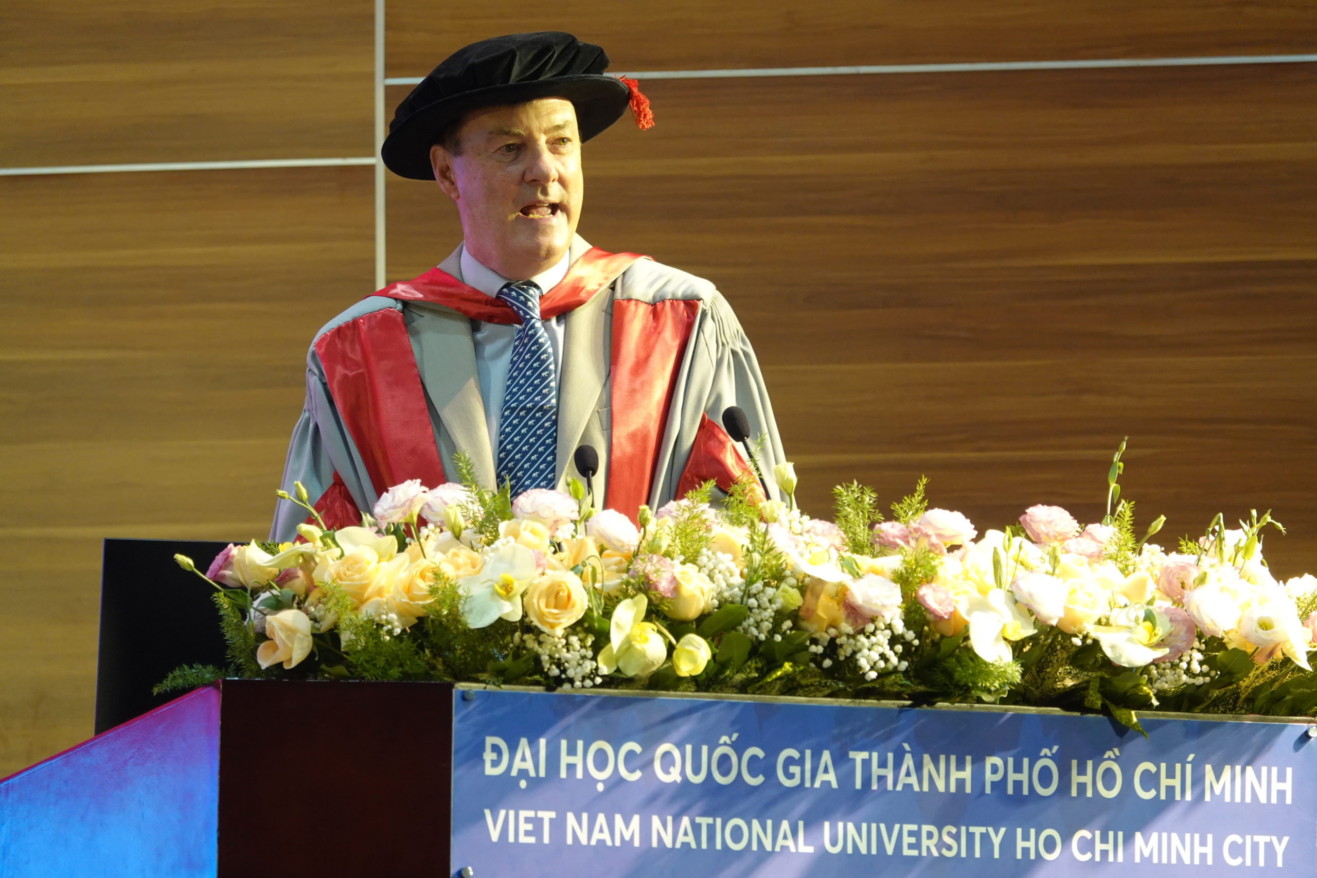 Notably, this year’s Graduation Ceremony also welcomed representatives from academic partners: Prof. Raymond Priest – Regional Director of Asia Pacific, Managing Director of International Educational Services of University of the West of England Bristol. In addition, the ceremony featured inspirational contributions from business representatives: Mr. Francesco Tran Van Lieng – Chairman, CEO of Vietnam Cacao Joint Stock Company, attended the afternoon session on November 23rd, 2024; Dr. Tran Viet Huan – President of the CIO Vietnam Community, on the morning of November 24th, 2024, delivered a speech to the graduates. That same afternoon, Mr. Tran An Khang – Business Director, ABB Automation and Electrification Vietnam, shared heartfelt messages and advice with the International University’s graduates on this momentous occasion.