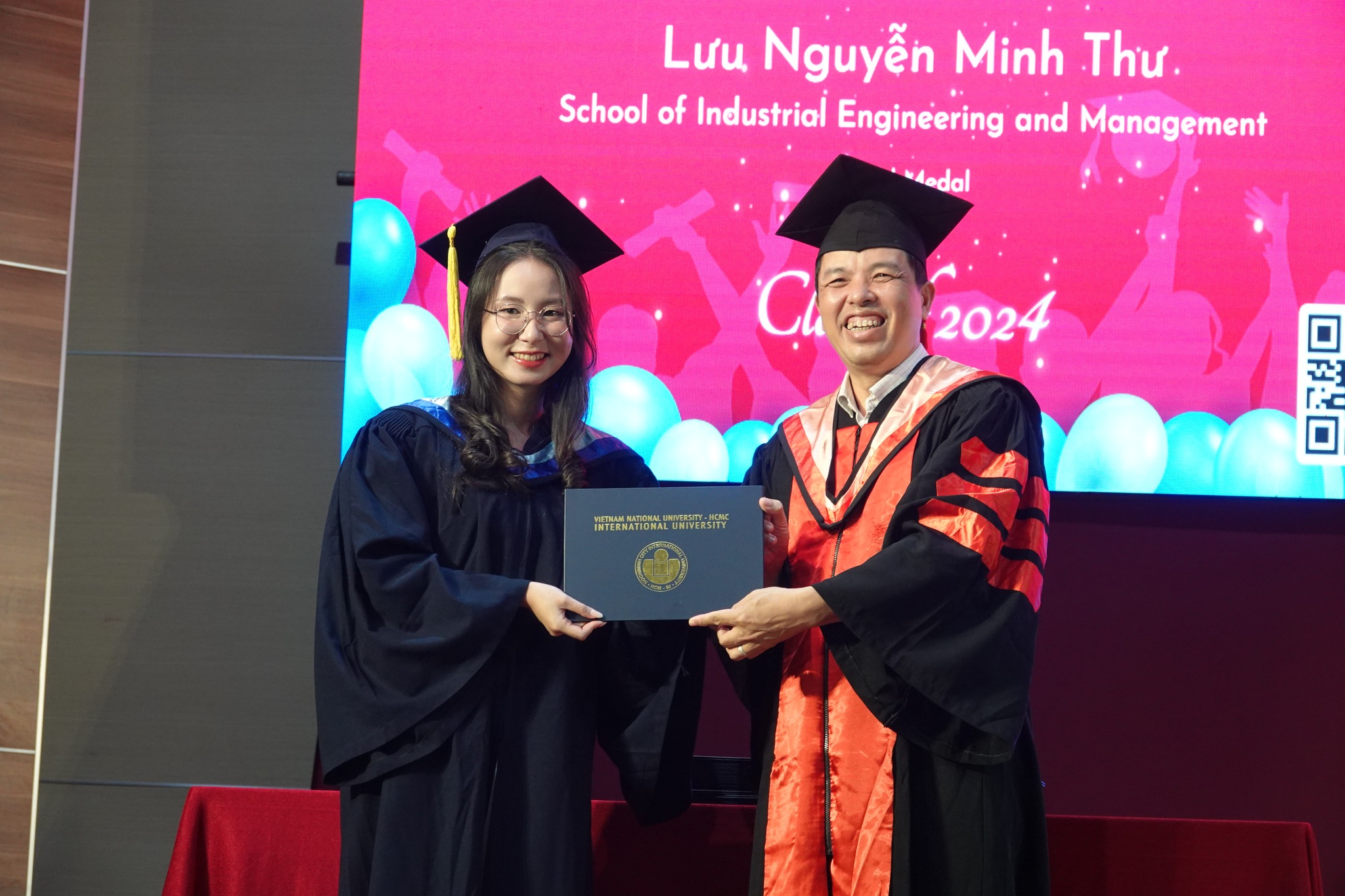 Assoc. Prof. Dr. Nguyen Van Hop – Dean of the School of Industrial Engineering and Management – conferred the diploma to Ms. Luu Nguyen Minh Thu – Valedictorian in Engineering.