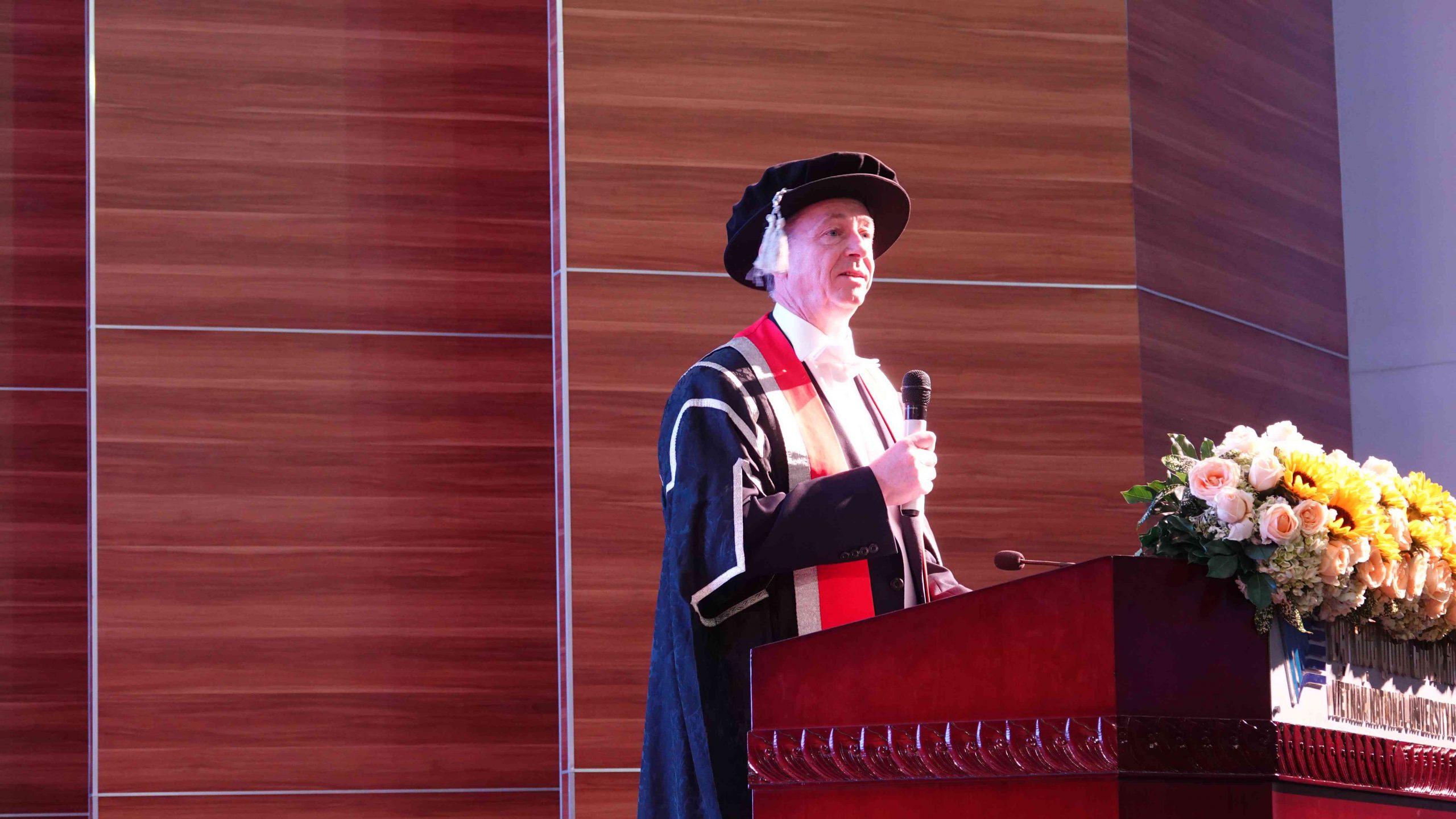 Dr. Tran Tien Khoa – Rector of International University – gave flowers to thank Professor. Raymond McDowell – Deputy Dean at Faculty of Business and Law, University of West of England