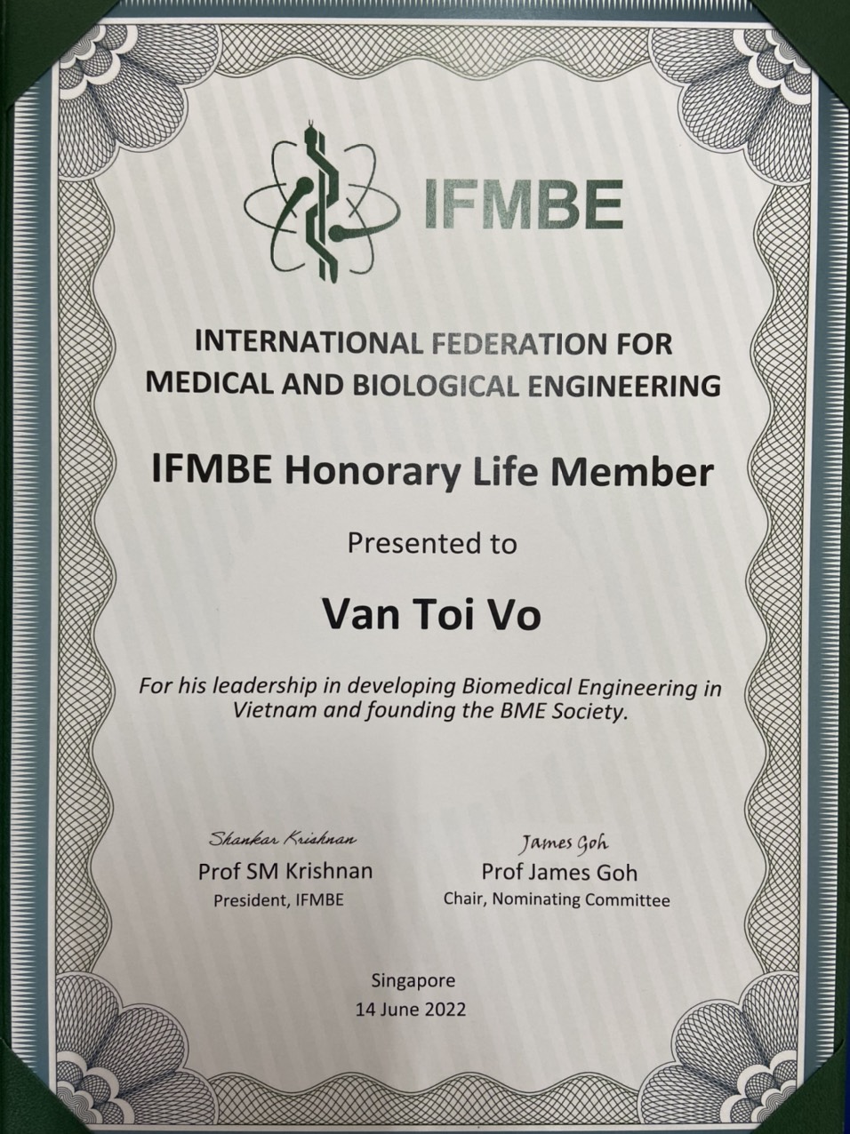 PROFESSOR VO VAN TOI RECEIVED HONORARY LIFE MEMBER AWARD FROM THE INTERNATIONAL FEDERATION FOR MEDICAL AND BIOLOGICAL ENGINEERING (IFMBE)