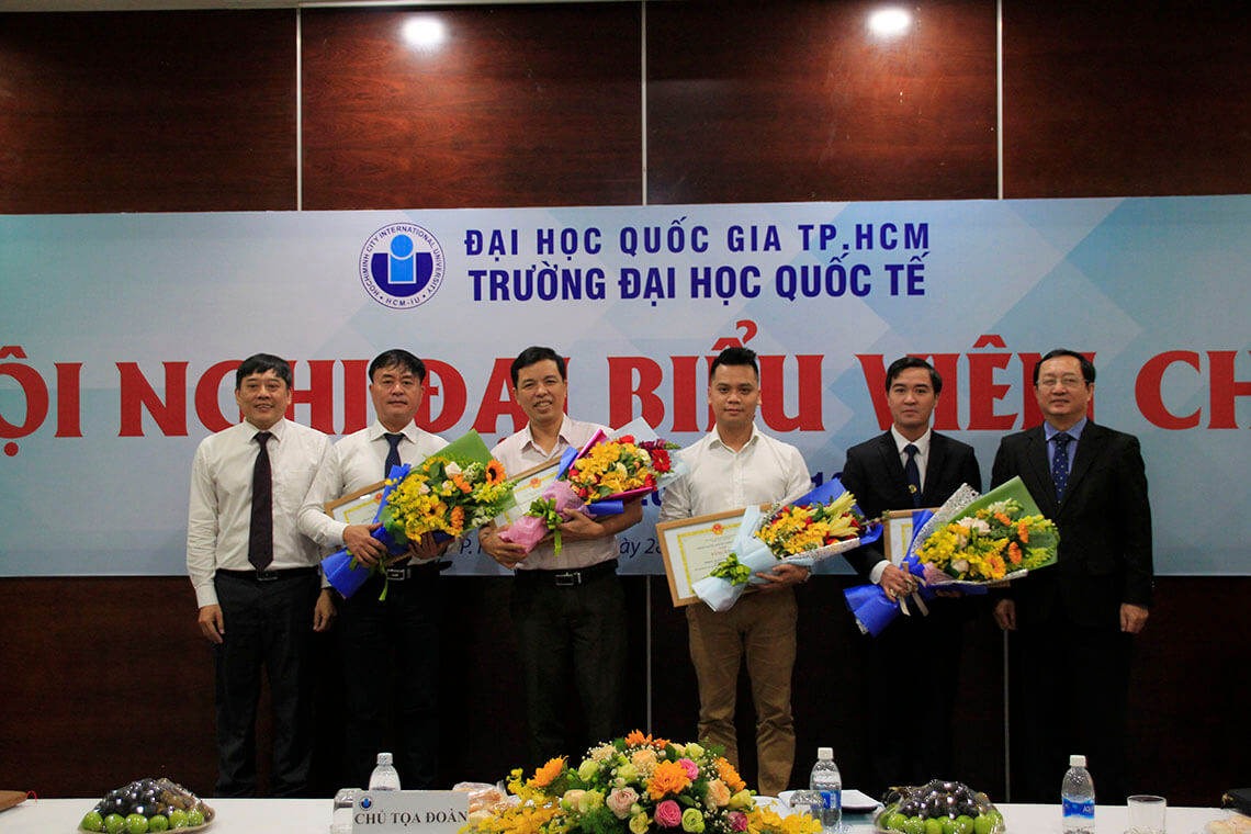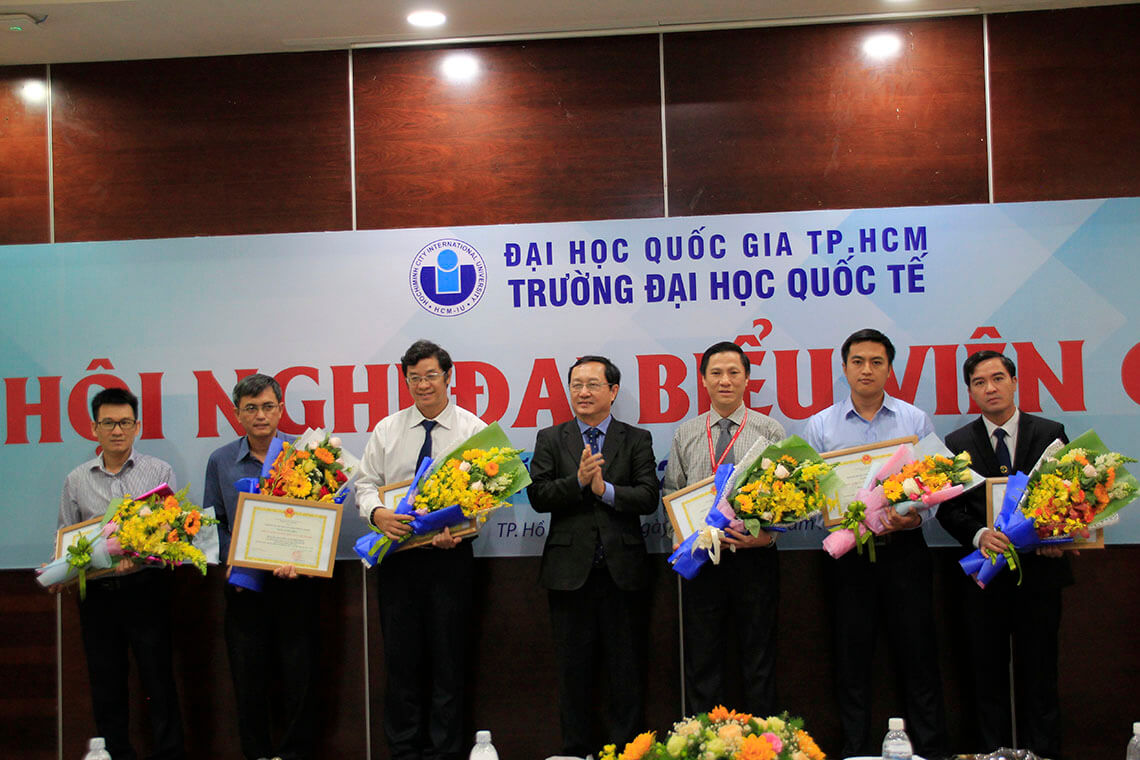 Các anh CBGV của trường ĐHQT nhận bằng khen Chiến sĩ thi đua cấp ĐHQG-HCM từ PGS.TS. Huỳnh Thành Đạt – Giám đốc ĐHQG-HCM.