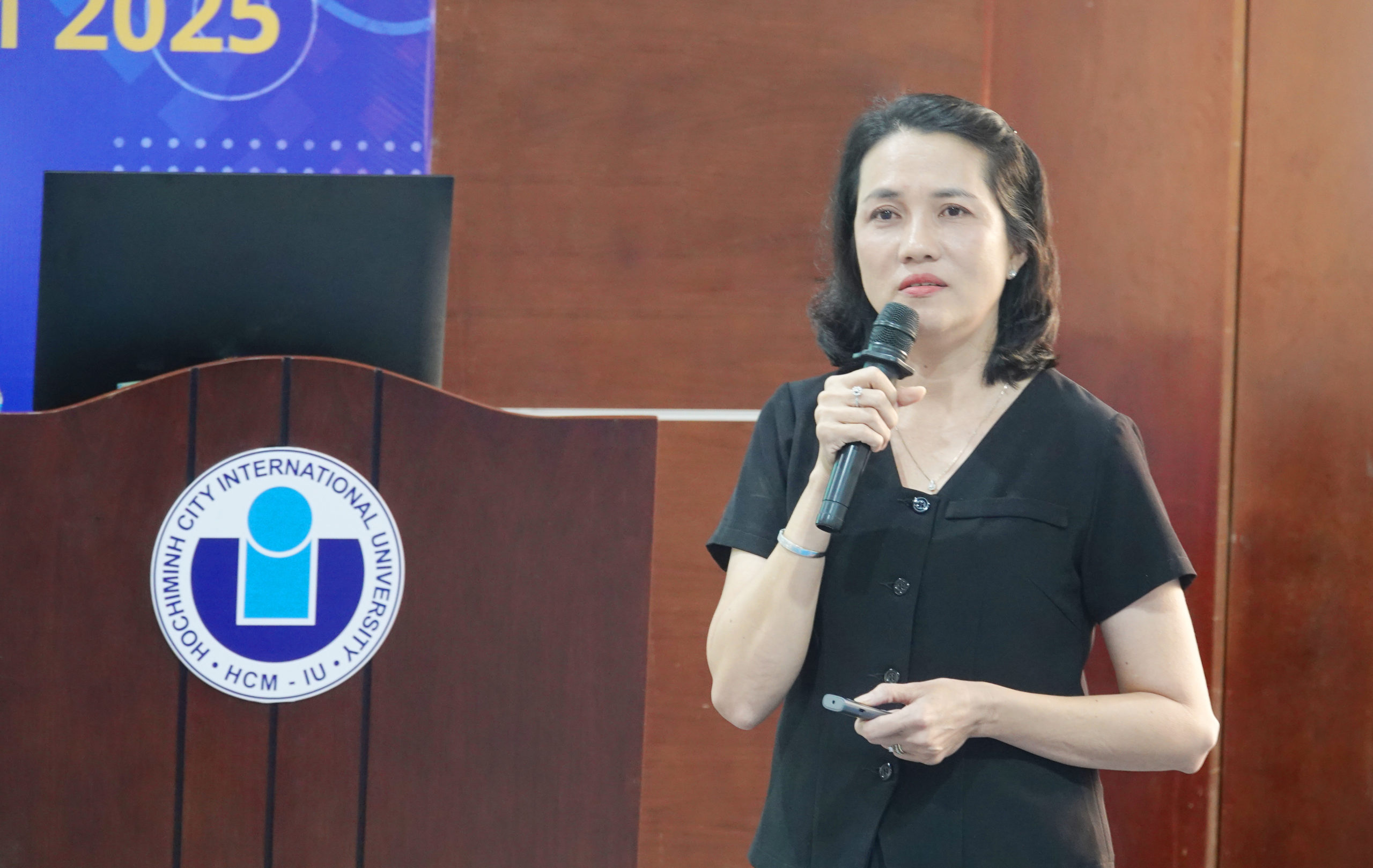 ThS. Nguyễn Thị Bích Ngọc – Đại diện phòng Quan hệ đối ngoại, báo cáo tham luận về chuỗi chương trình bài giảng đại chúng – trò chuyện cùng chuyên gia.