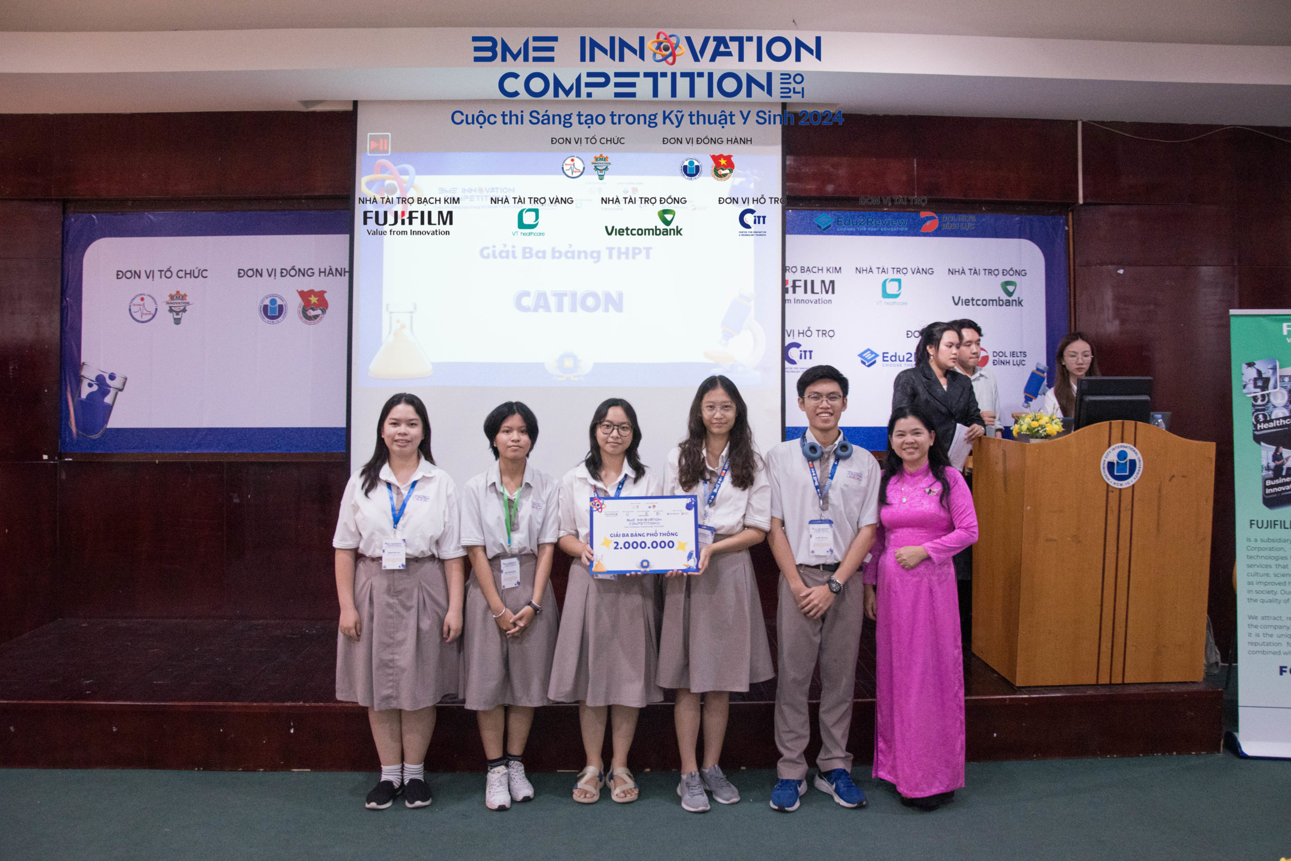 Giải ba Bảng THPT thuộc về đội Cation với đề tài “Tái Tạo Vú Hậu Phẫu Thuật Cắt Bỏ Trong Điều Trị Ung Thư Vú Bằng Mô Hình Khung Sinh Học In 3D Từ Polylactic Acid (PLA) Và Gelatin”. Hiện nay, ung thư vú đang là một căn bệnh phổ biến ở phụ nữ trên thế giới, sau khi phải cắt bỏ tuyến vú, kéo theo nhiều hậu quả về mặt tinh thần như tự ti, trầm cảm. Vì thế nhu cầu tái tạo, phục hồi hình dạng vú hậu phẫu thuật ở phụ nữ là điều cấp thiết. Với mục đích tạo ra mô hình giàn giáo định hướng tái tạo mô vú cho bệnh nhân bằng cách kết hợp công nghệ in 3D với loại nhựa polylactic acid (PLA) có thể phân hủy sinh học, độ tương thích cao và bao bọc bởi gelatin giảm viêm. Mô hình bao gồm hai thành phần cấu trúc độc lập, bên ngoài cung cấp sự ổn định về cơ sinh học để giảm thiểu sự truyền tải đến mô mới hình thành trong khi cấu trúc bên trong cung cấp lỗ liên kết hoàn toàn để tạo điều kiện tái tạo mô.