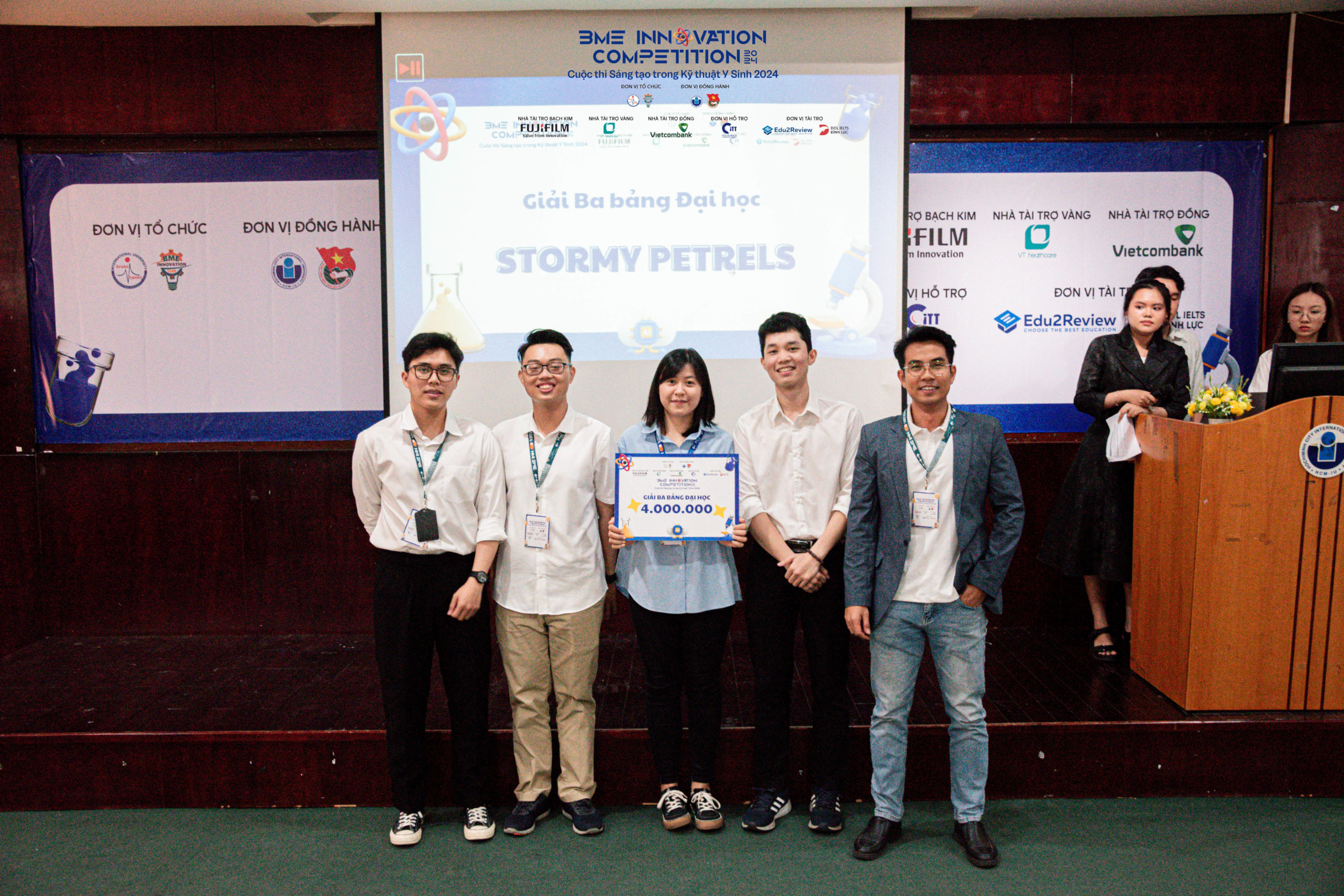 Giải ba Bảng Đại Học gọi tên đội Stormy Petrels với đề tài “Preparation Of Protein Nanoparticles Made From Chicken Eggs Used To Reduce The Inflammation Of Ulcerative Colitis”. Viêm loét đại tràng là một tình trạng viêm mãn tính ở đại tràng do nhiều yếu tố gây ra và các phương pháp điều trị thông thường thường mang lại những tác dụng phụ đáng kể và không có tác dụng giảm đau kéo dài. Trong những năm gần đây, mối quan tâm đến các chất mang nano cho hệ thống phân phối thuốc và dược phẩm đã tăng lên, trong đó protein được công nhận là vật liệu lý tưởng do độc tính thấp, khả năng tương tác với dung môi và hoạt tính sinh học. Khi theo đuổi các giải pháp đổi mới để kiểm soát bệnh viêm loét đại tràng, một phương pháp độc đáo đã được nghiên cứu bằng cách khám phá tiềm năng điều trị của các hạt nano protein có nguồn gốc từ trứng gà – một nguyên liệu tự nhiên và tiết kiệm chi phí thông qua việc điều chế các hạt nano chuyên dụng với những ưu điểm độc đáo. Không chỉ là nguồn cung cấp giá trị dinh dưỡng thiết yếu, trứng còn chứa một số protein và peptide có đặc tính trị liệu, bao gồm các thành phần kháng khuẩn và điều hòa miễn dịch (bao gồm lysozyme, avidin, ovalbumin và ovomucoid). Điều này cho thấy trứng có thể đóng vai trò là nguồn cung cấp các hoạt chất sinh học tự nhiên có giá trị cho các ứng dụng lâm sàng. Với những ưu điểm vượt trội như sử dụng thành phần tự nhiên (trứng gà tươi) và các chất hóa học dễ tiếp cận, nghiên cứu chế tạo hạt nano protein từ trứng gà nhằm giảm tình trạng viêm loét đại tràng được tiến hành với hứa hẹn mang lại kết quả ổn định, dễ thực hiện, có tính thương mại hóa cao như mong đợi.