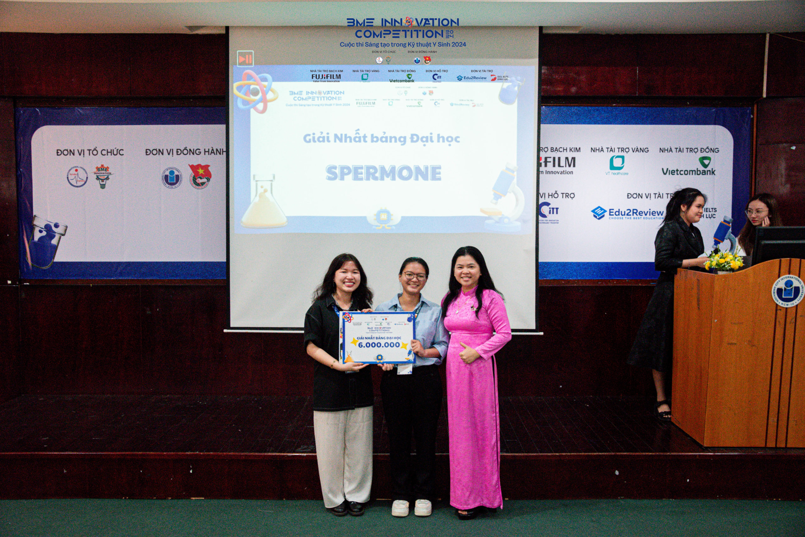 Giải nhất Bảng Đại Học thuộc về đội SpermOne với đề tài “SpermOne – Microfluidics-based assisted reproductive technology”. Ý tưởng đề tài xoay quanh vấn đề sức khỏe toàn cầu là vô sinh, ảnh hưởng đến hàng triệu người trong độ tuổi sinh sản trên toàn thế giới. Nổi bật trong xu hướng nghiên cứu mới nhằm giải quyết tình trạng vô sinh hiện nay, chip vi chọn lọc vi lỏng đặc biệt phù hợp ứng dụng lâm sàng trong chuẩn bị mẫu tinh trùng nhờ hiệu quả cao. Các phương pháp chọn lọc vi lỏng dựa trên khả năng di chuyển của tinh trùng, bơi xuôi dòng, ngược dòng, qua các kênh dài hoặc qua màng. Nhóm chúng tôi đã nghĩ ra chip SpermOne áp dụng kỹ thuật vi lỏng để đạt được mục tiêu chọn lọc tinh trùng có khả năng di chuyển tốt, độ bền tinh trùng cao và hiệu quả phục hồi. Chip SpermOne được sản xuất dựa trên cơ chế bơi của tinh trùng và bộ lọc vật lý để chọn hình dạng tinh trùng đồng thời khắc phục những nhược điểm của chip nghiên cứu trước đây. Nghiên cứu được thực hiện với mong muốn ứng dụng các kỹ thuật y sinh vào sản phẩm lâm sàng nhằm giảm áp lực công việc cho các nhà phôi học, tránh sai sót hoặc hạn chế thất thoát mẫu tinh trùng của bệnh nhân, góp phần tiết kiệm chi phí và giảm áp lực kinh tế cho nhiều cặp vợ chồng.