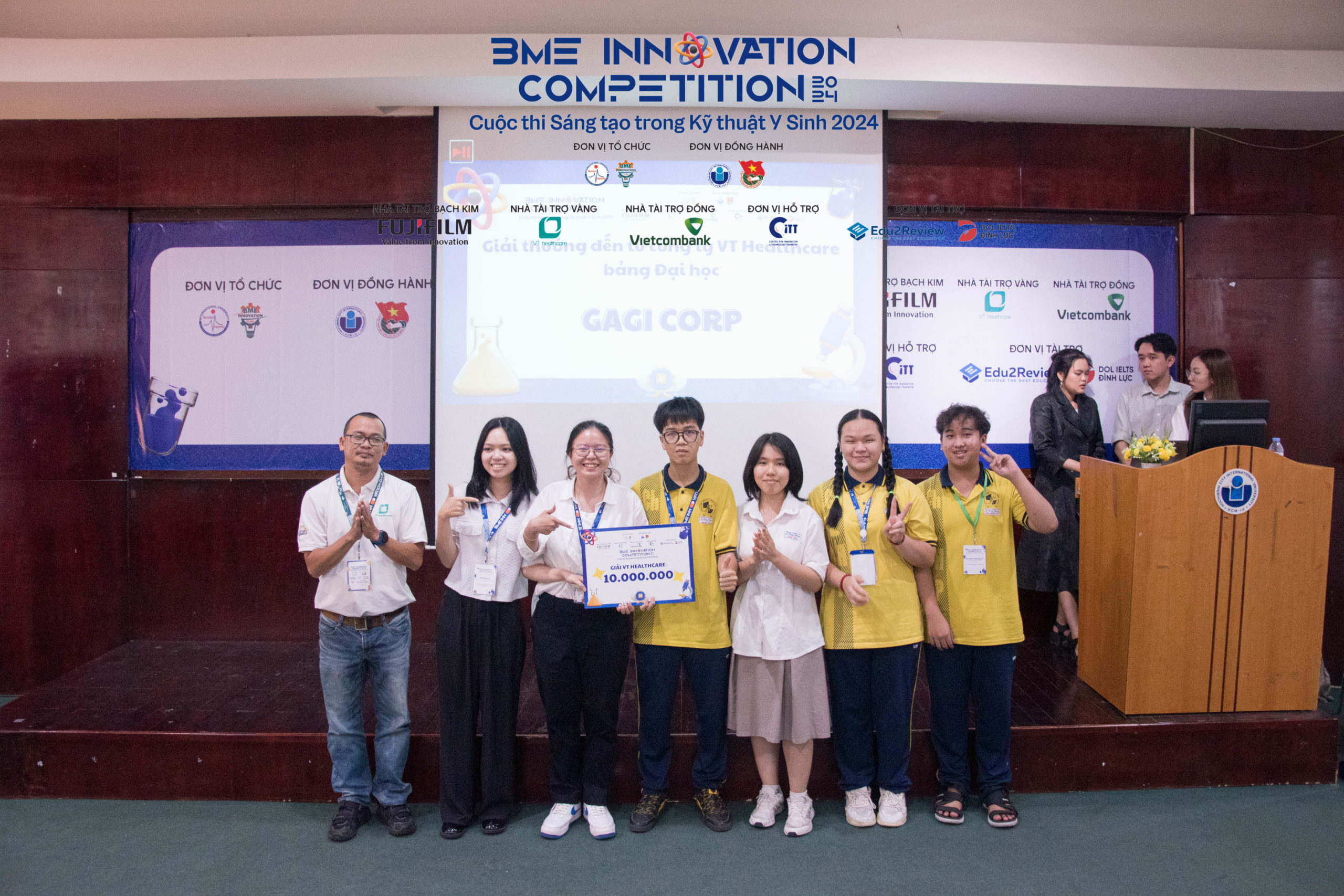 Giải Nhà tài trợ VT Healthcare Bảng Đại Học trao cho đội Gagi Corp với đề tài “A Computer Vision-based Serious Game System for Training Squat Exercises Toward Smart Gym”. Ý tưởng dự thi xoay quanh việc phát triển một trò chơi nghiêm túc nhằm hướng dẫn tập luyện squat dựa trên các chuyển động cơ thể của người tập kết hợp với công nghệ computer vision. Trò chơi không chỉ kích thích sự hứng thú và kiên trì trong tập luyện, mà còn hỗ trợ xây dựng thói quen sống lành mạnh. Trò chơi còn có thể cung cấp lời khuyên về chế độ tập luyện, hướng dẫn các bước tập, và theo dõi tình trạng sức khỏe, giúp người tập cảm thấy hứng khởi và tận hưởng mỗi buổi tập.