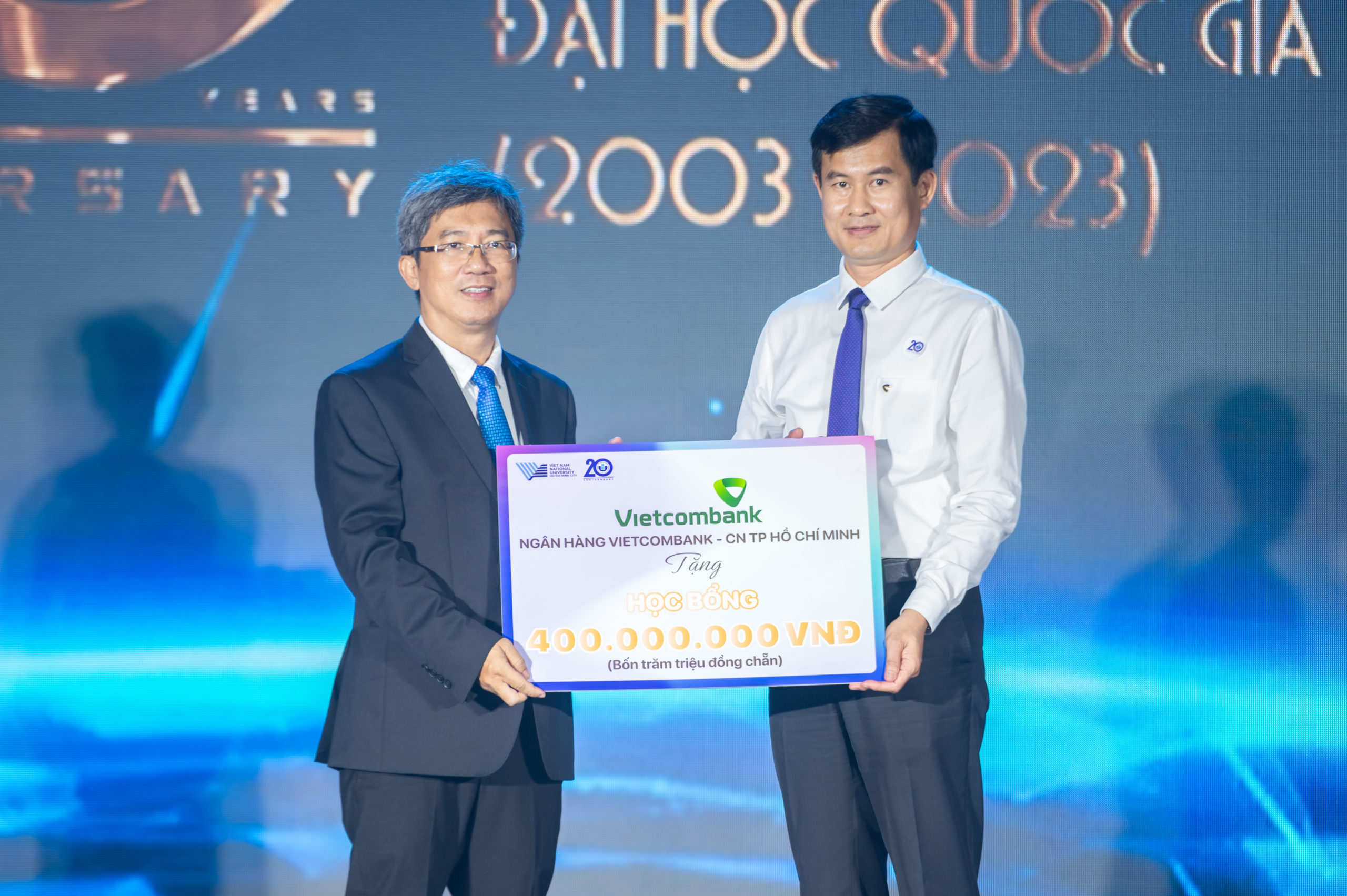 Đại diện trường ĐHQT, PGS.TS. Đinh Đức Anh Vũ nhận học bổng trị giá 400.000.000 đồng từ Ông Hạ Chí Hiếu – Phó Giám đốc Ngân hàng Vietcombank Chi nhánh Hồ Chí Minh.