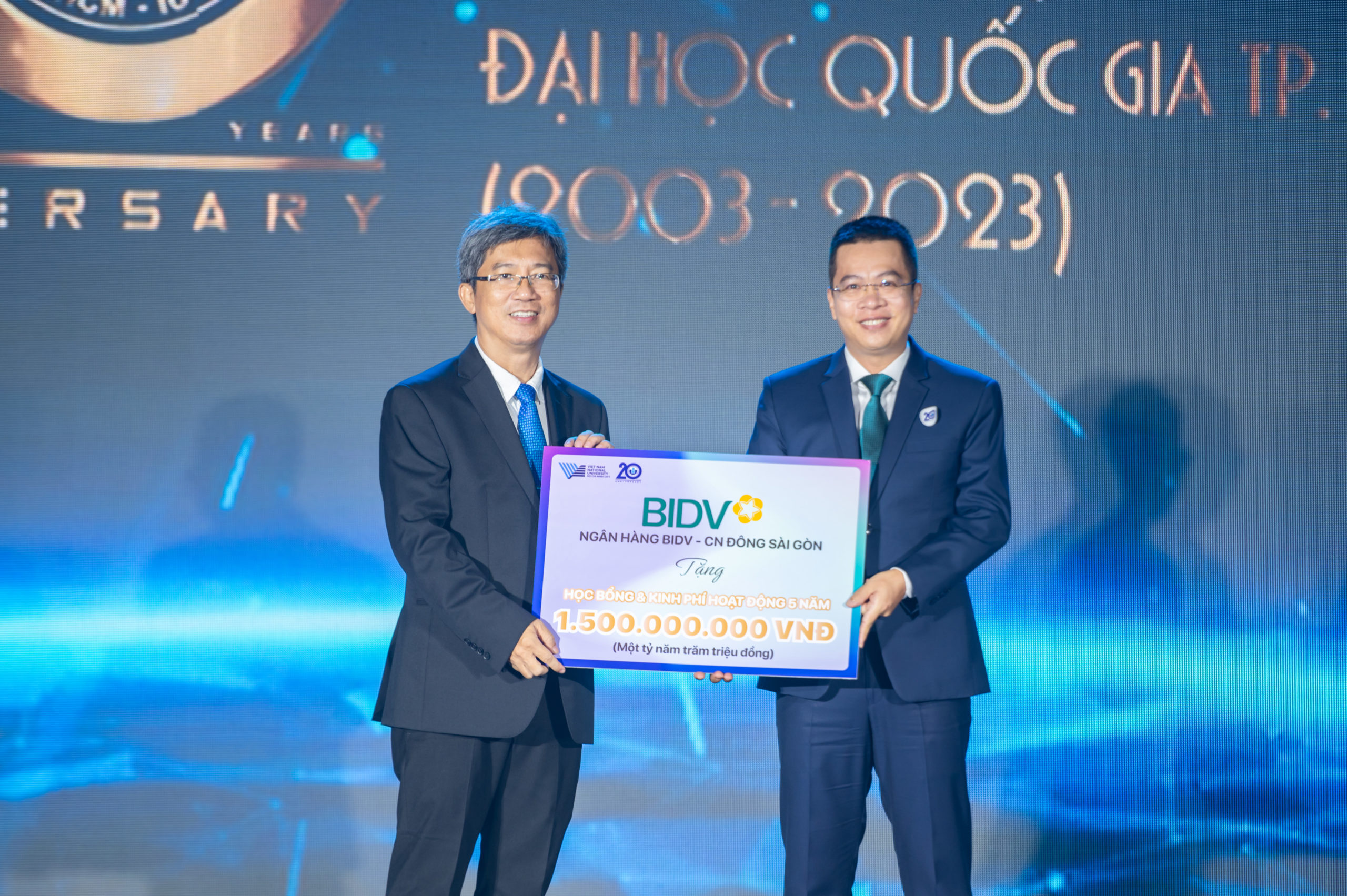 Đại diện trường ĐHQT, PGS.TS. Đinh Đức Anh Vũ nhận học bổng trị giá 1.500.000.000 đồng cho giai đoạn 5 năm từ Ông Đặng Văn Kiên, Giám đốc Ngân hàng BIDV – Chi nhánh Đông Sài Gòn.