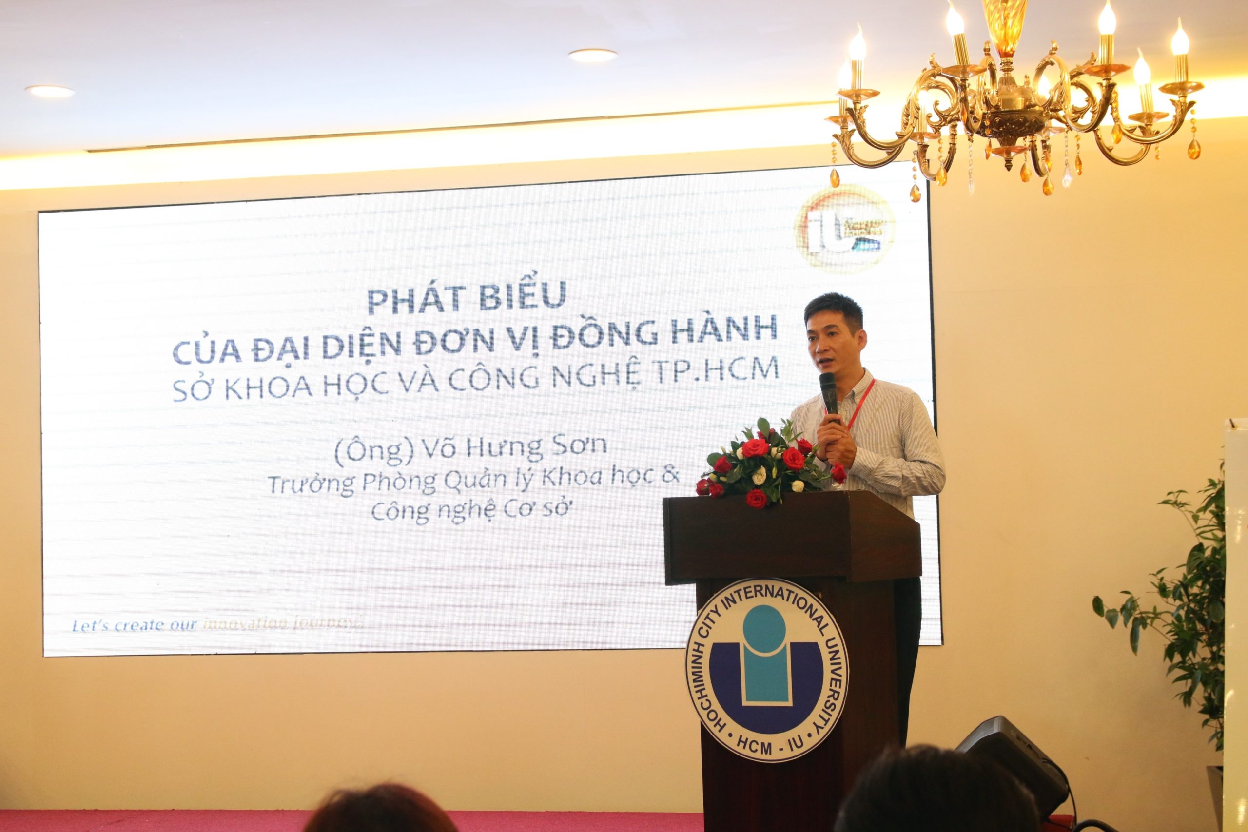 Ông Võ Hưng Sơn – Trưởng Phòng Quản lý Khoa học và Công nghệ cơ sở Sở Khoa học Công nghệ TP.HCM – phát biểu tại buổi khai mạc Vòng Chung kết cuộc thi IU Start Up Demo Day 2023.