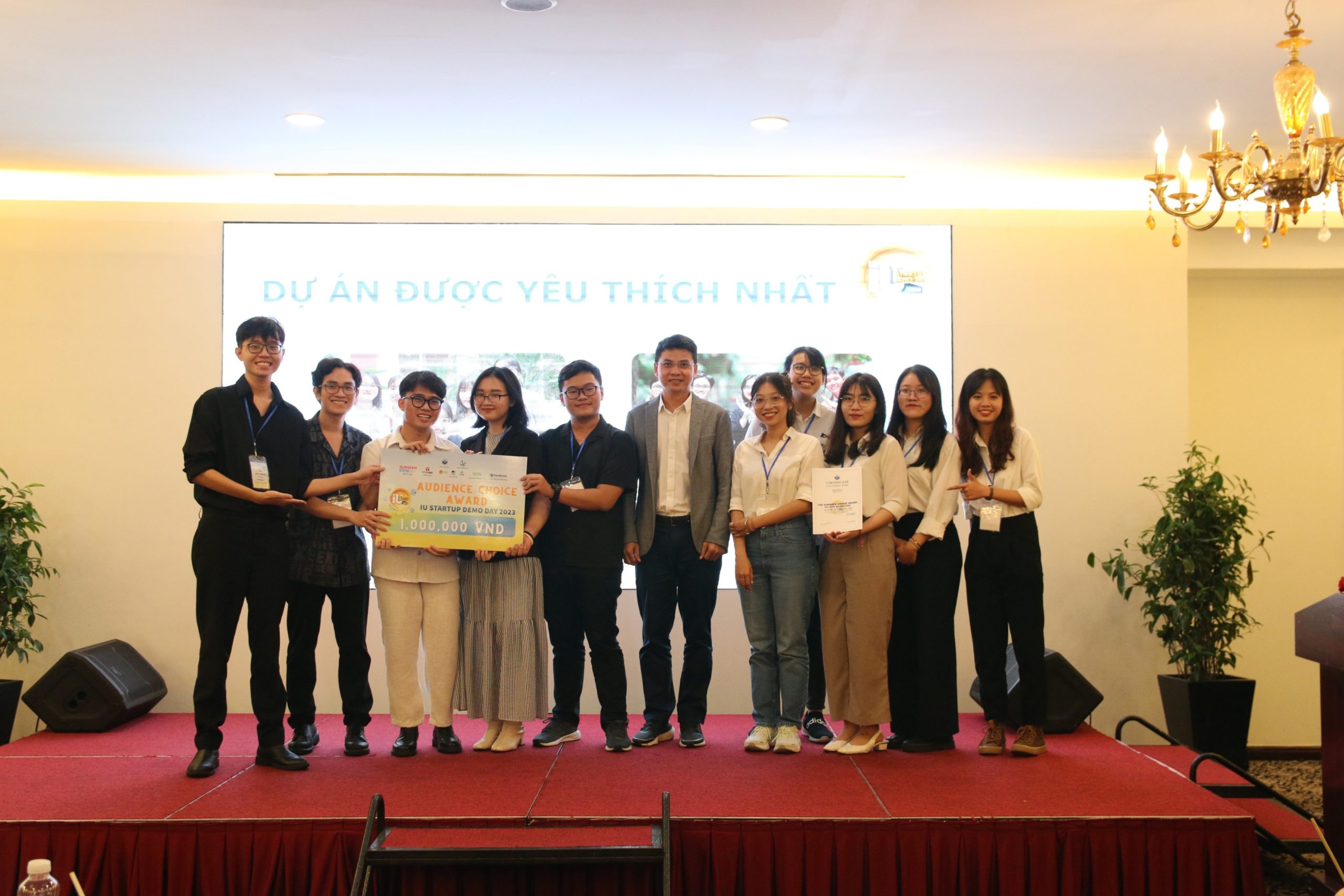 Nhóm Acechup và Better cùng nhận giải thưởng được yêu thích nhất từ TS. Nguyễn Ngọc Duy Phương – Phó Trưởng Phòng Quản lý Khoa học trường ĐHQT, Thành viên Ban Giám khảo.