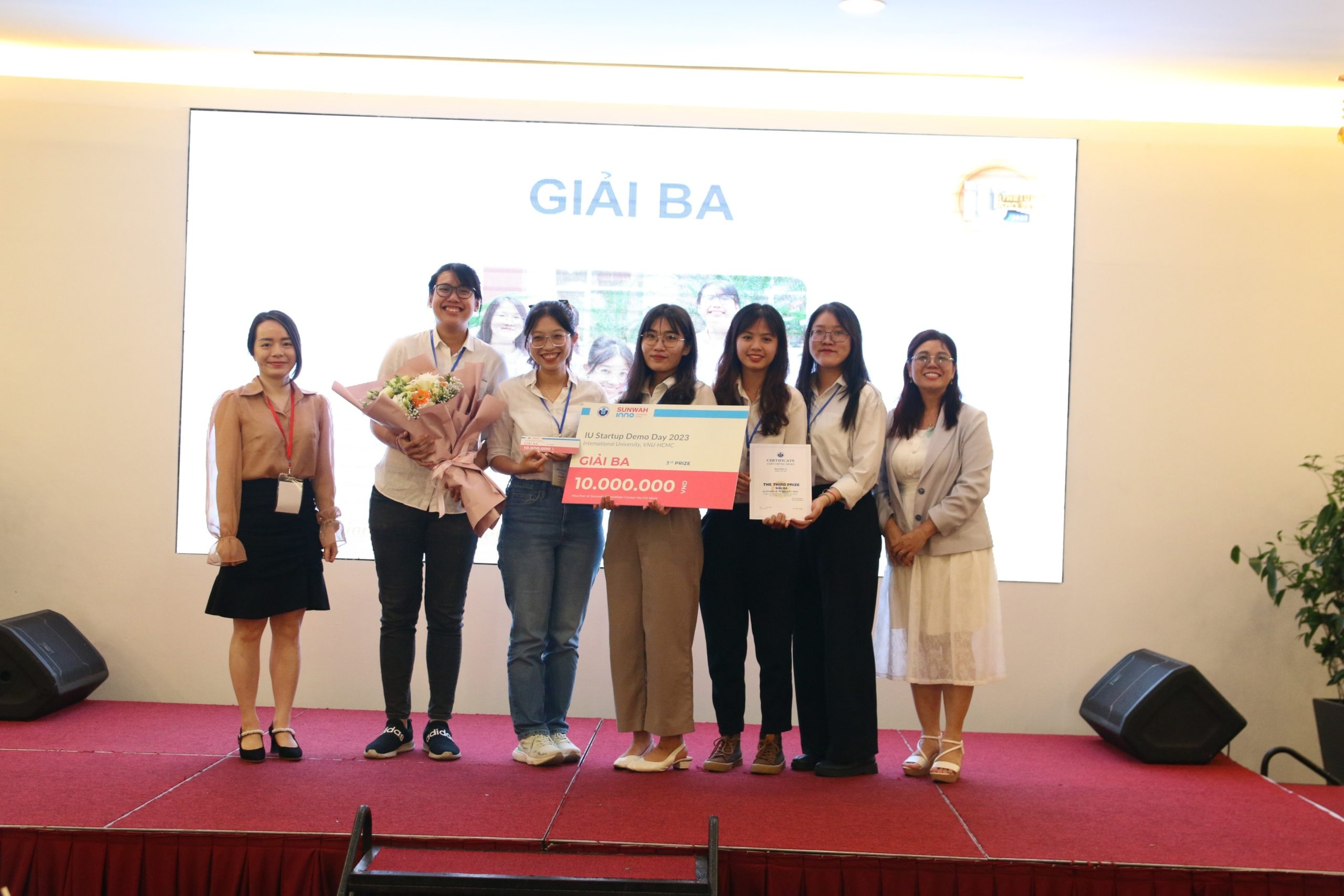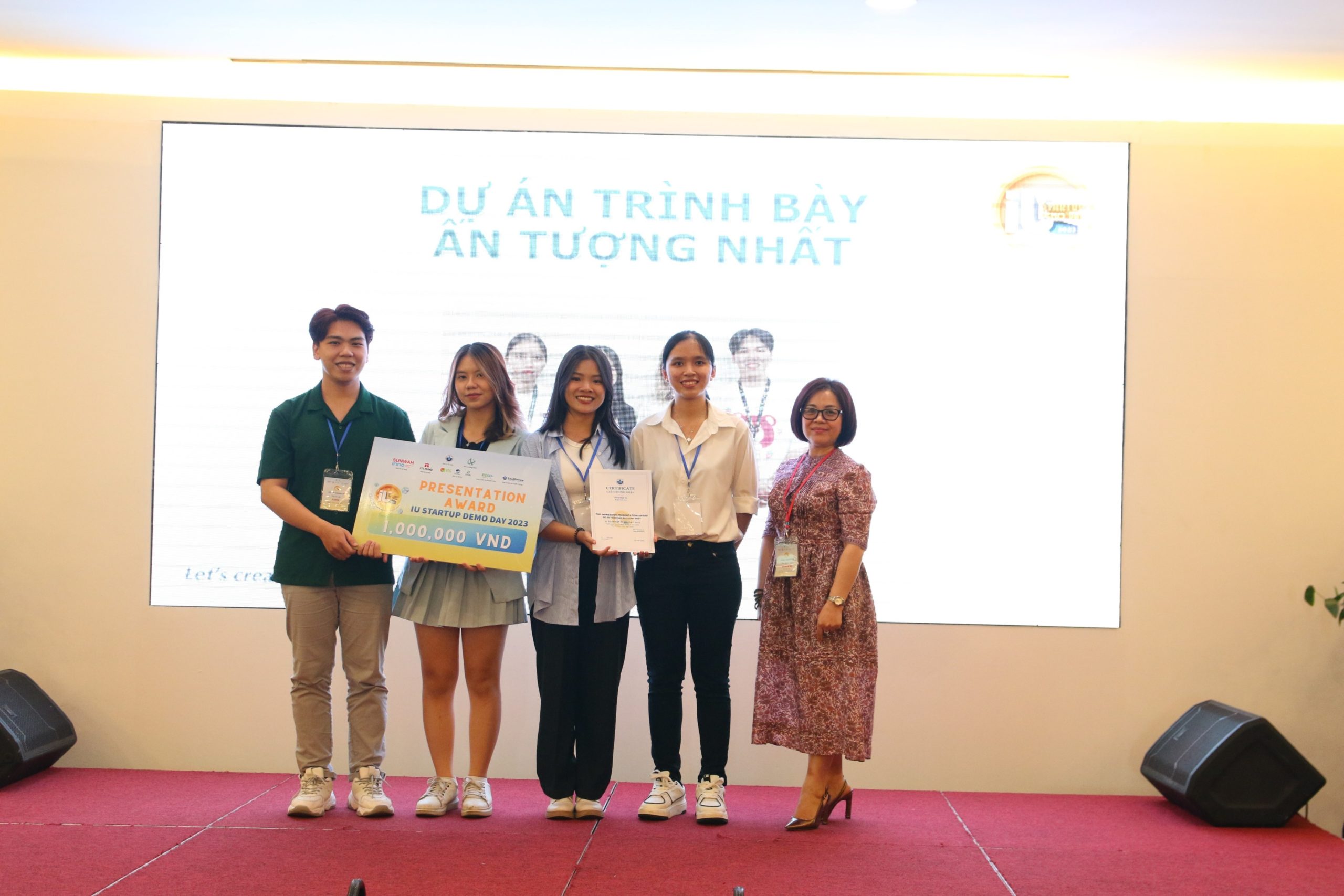 Các thành viên nhóm Fastie nhận giải Trình bày ấn tượng nhất từ bà Lê Thị Bé Ba – Phó Giám đốc Trung tâm Ươm tạo Doanh nghiệp Nông nghiệp Công nghệ cao (AHBI), thành viên Ban Giám khảo.