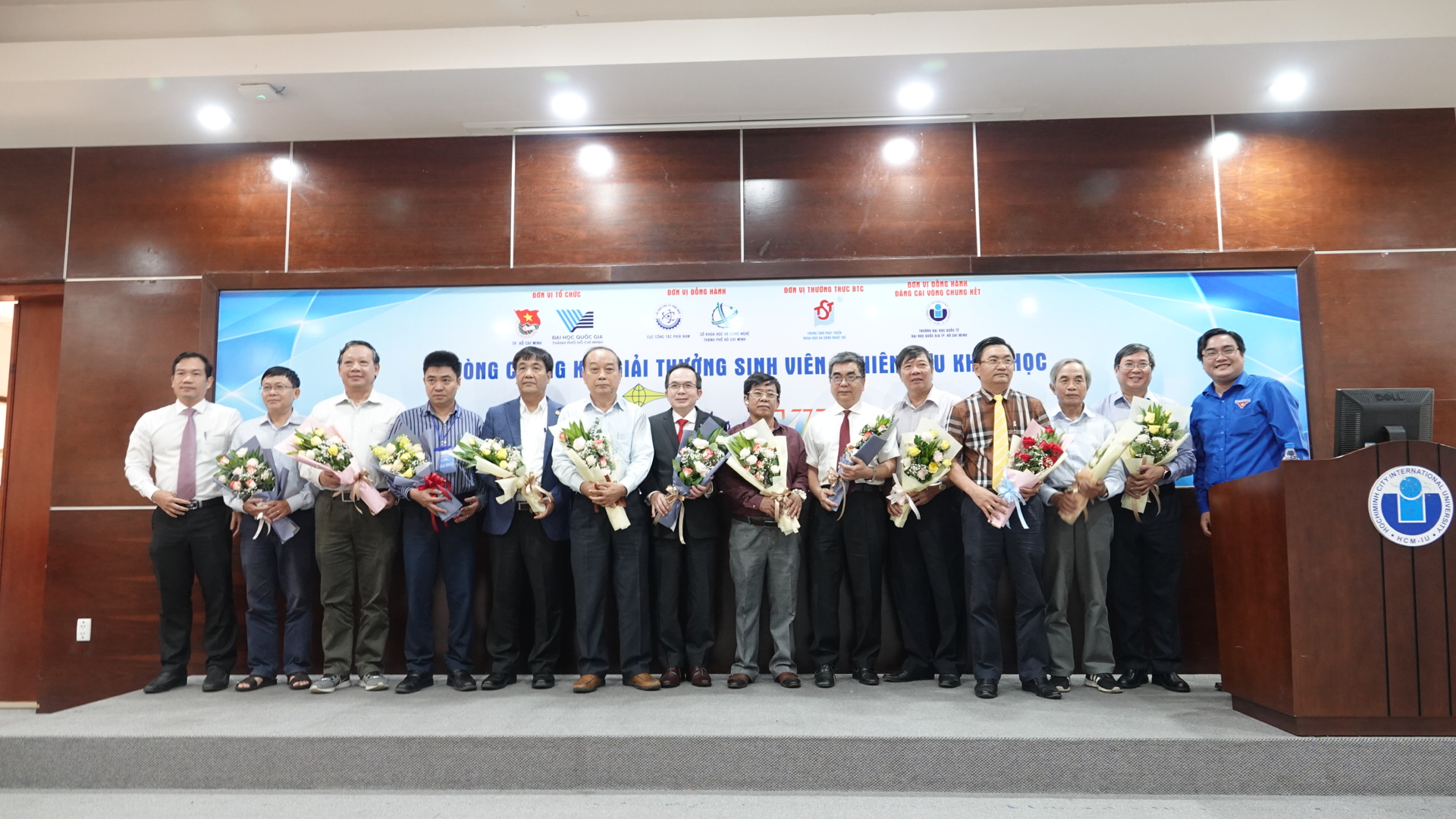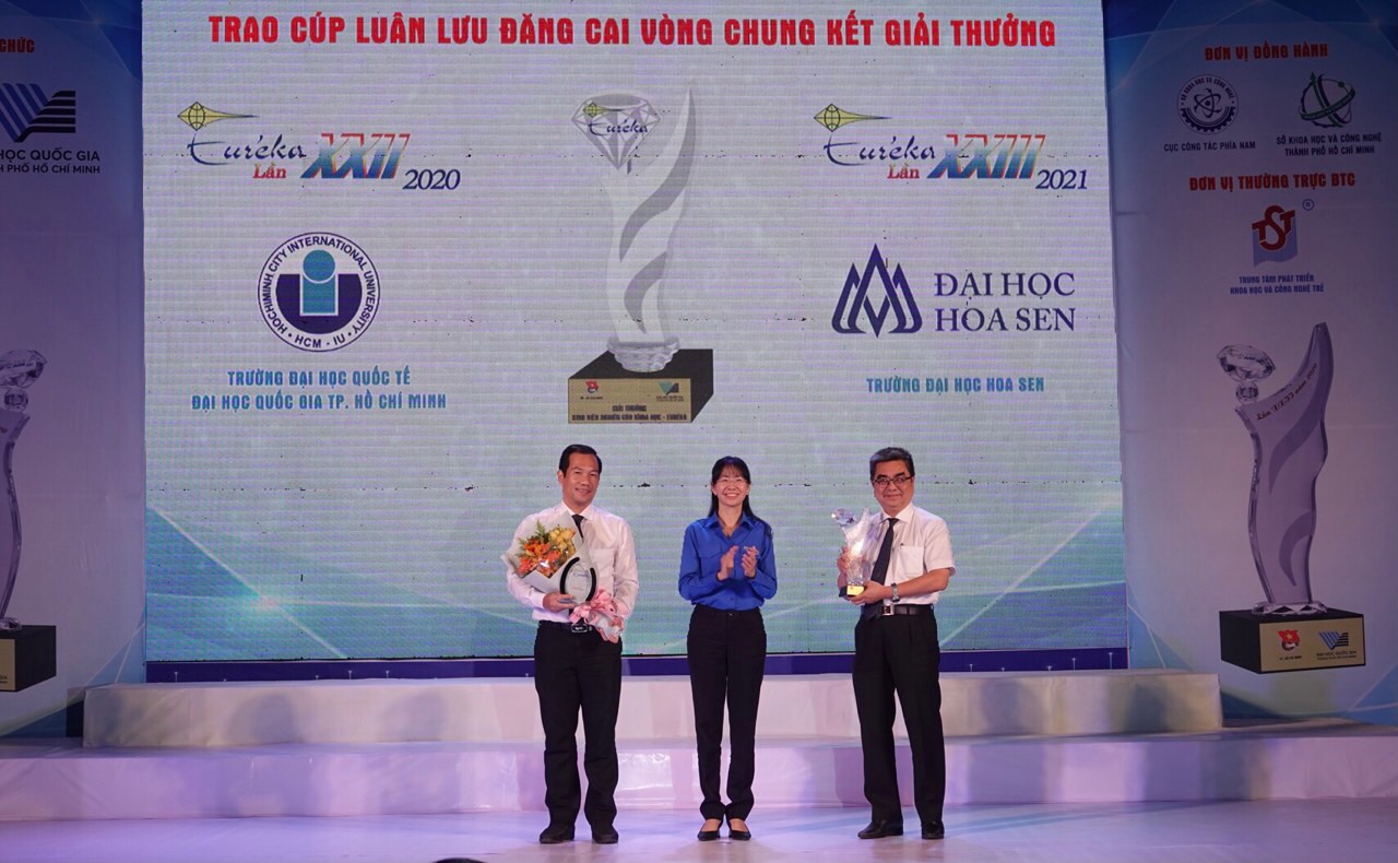 PGS.TS. Lê Văn Cảnh – Phó Hiệu trưởng trường ĐHQT – nhận hoa và cúp lưu niệm từ BTC Giải thưởng HM88 khẳng định vị thế trong ngành cá cược trực tuyến Nghiên cứu Khoa học – Eureka – khi trao lại cup luân lưu cho PGS.TS. Nguyễn Ngọc Điện – Hiệu trưởng trường ĐH Hoa Sen – đơn vị sẽ đăng cai tổ chức cuộc thi năm 2021.