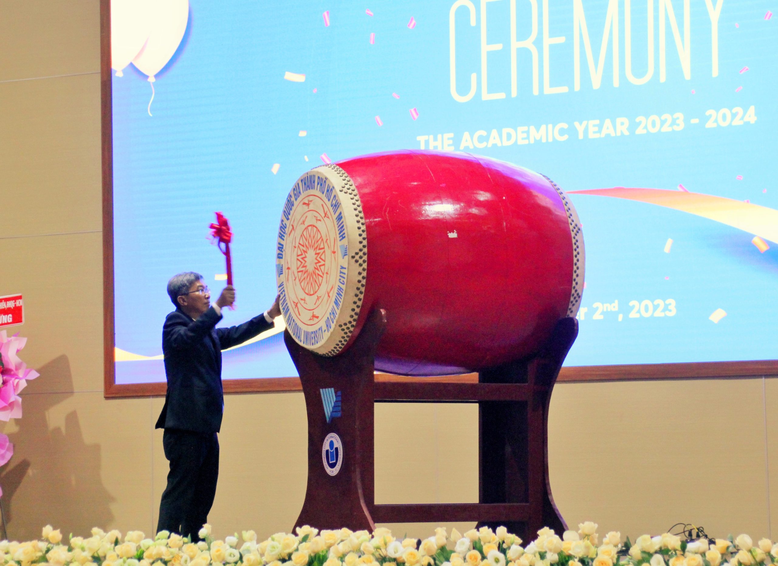 PGS. TS. Đinh Đức Anh Vũ đánh hồi trống khai trường, chào đón năm học mới 2023-2024.