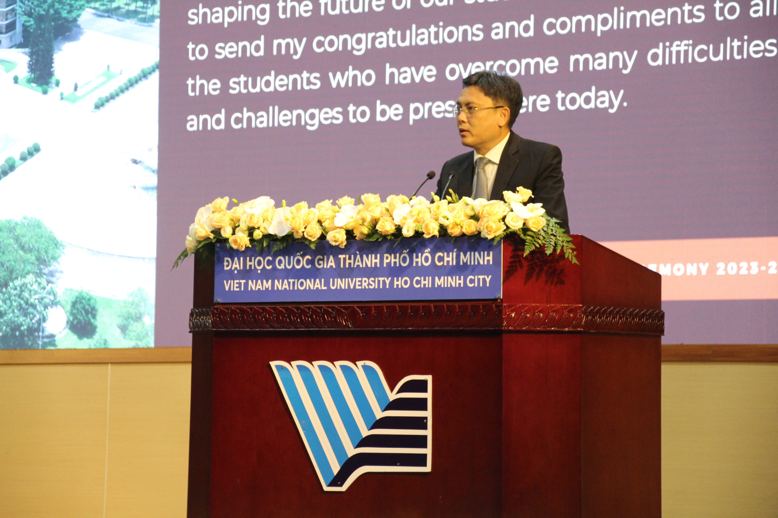 PGS.TS Nguyễn Minh Tâm – Phó Giám đốc ĐHQG-HCM lên bục danh dự để phát biểu chỉ đạo.