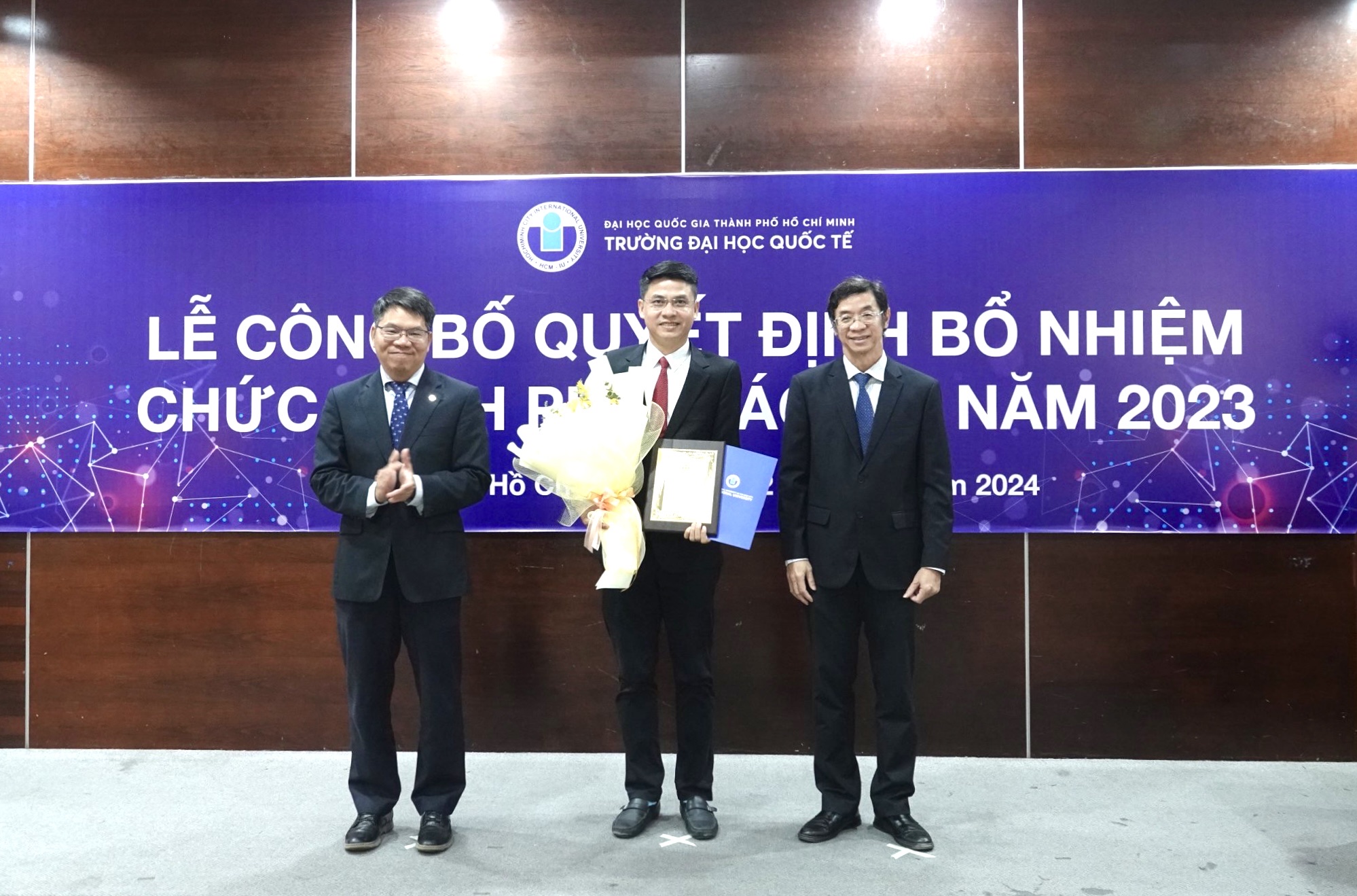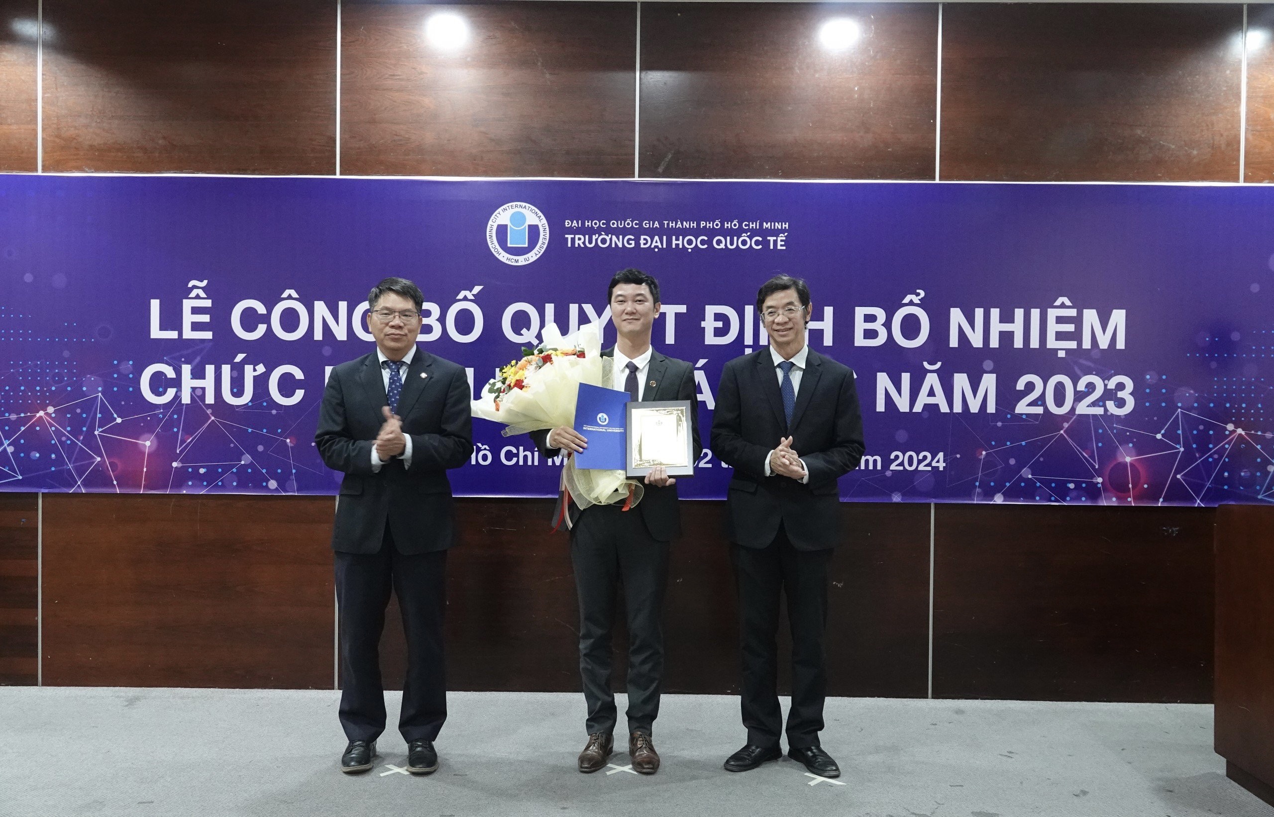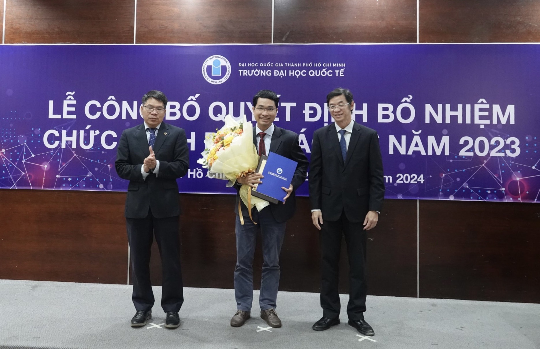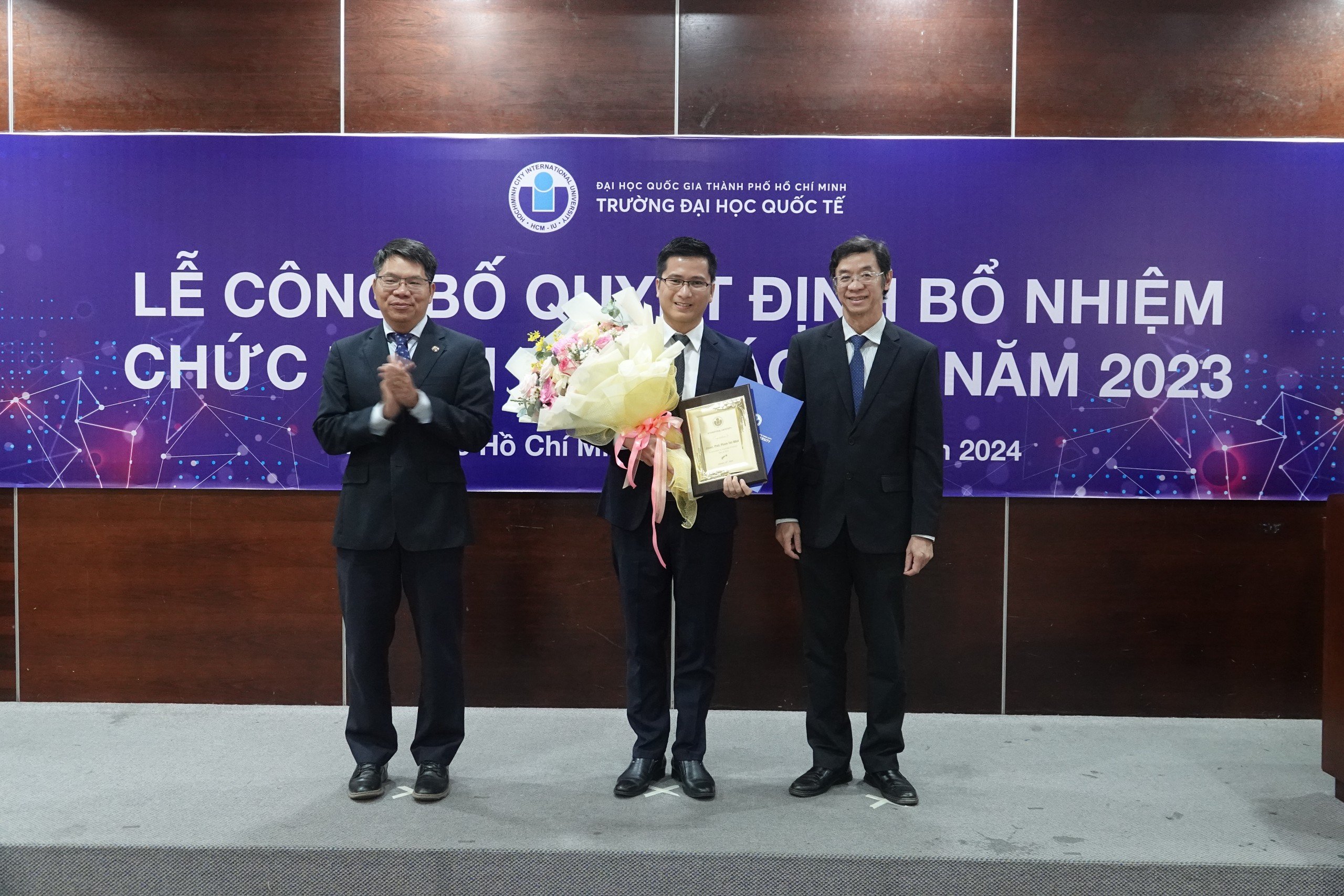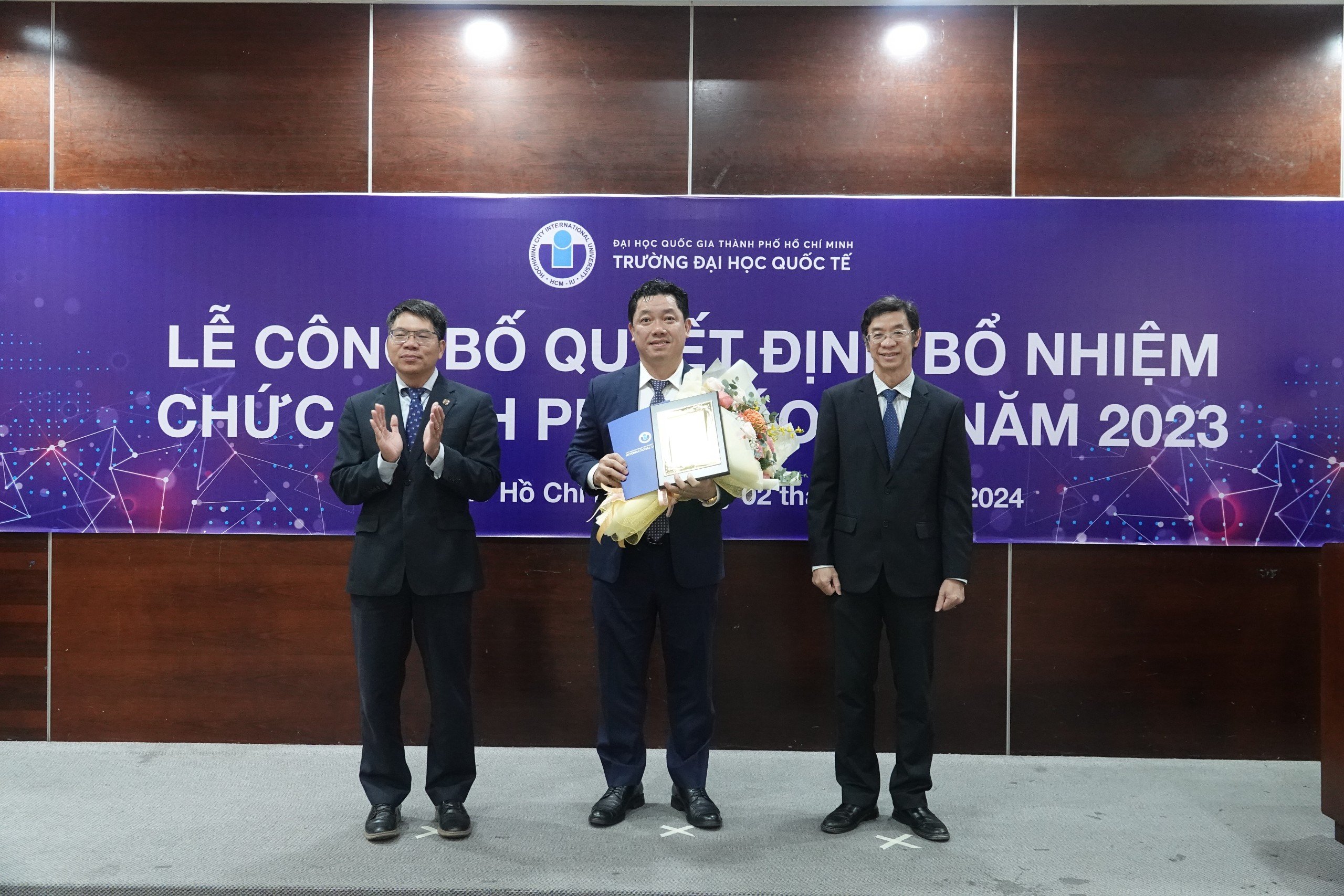 PGS. TS. Lê Văn Thăng – Hiệu trưởng trường ĐHQT – và TS. Hồ Nhựt Quang – Bí thư Đảng ủy, Chủ tịch Hội đồng trường – trao quyết định bổ nhiệm cho PGS. TS. Nguyễn Ngọc Duy Phương – Phó Trưởng Phòng Quản lý Khoa học, Giảng viên Khoa Kinh tế Tài chính Kế toán.