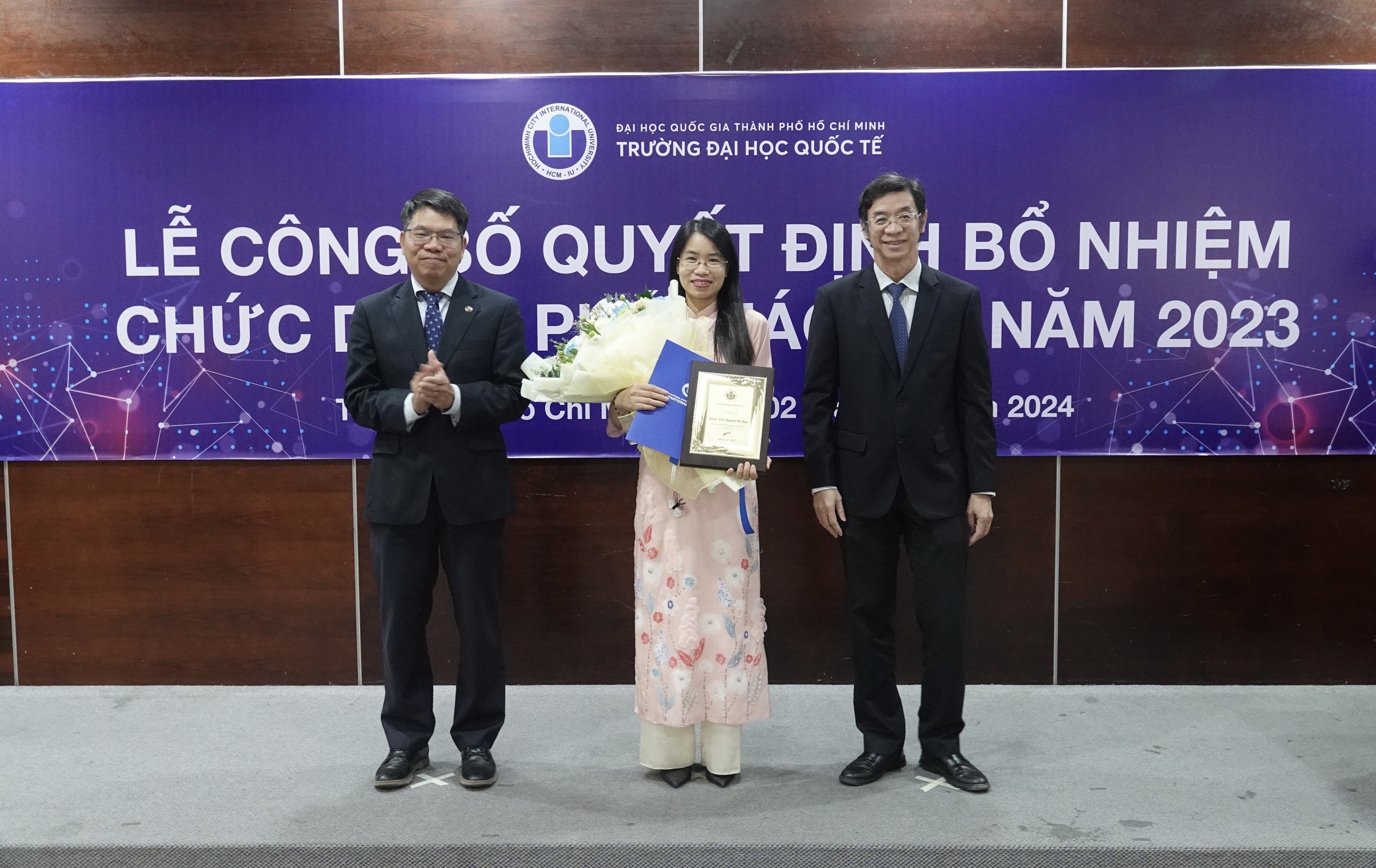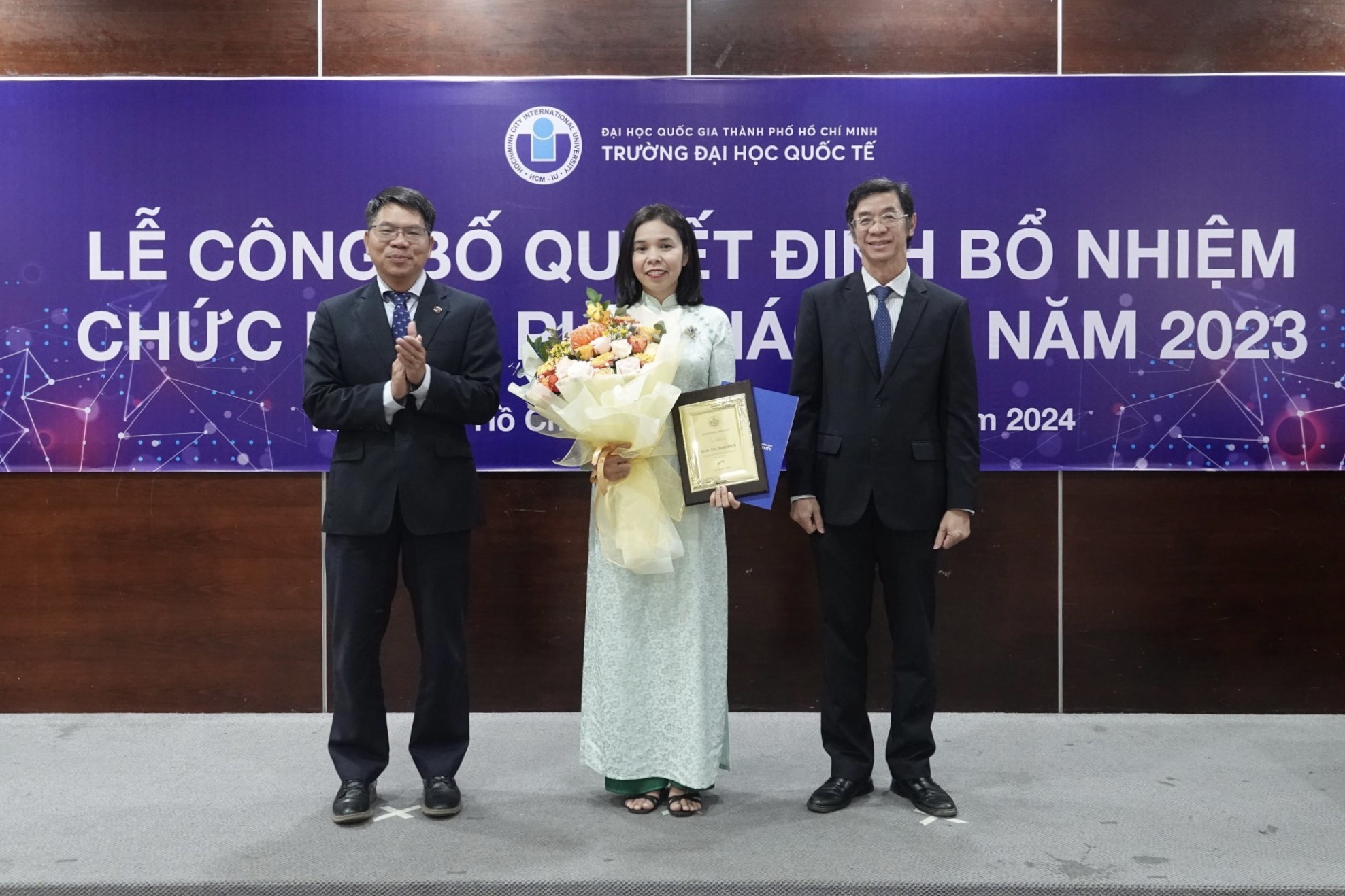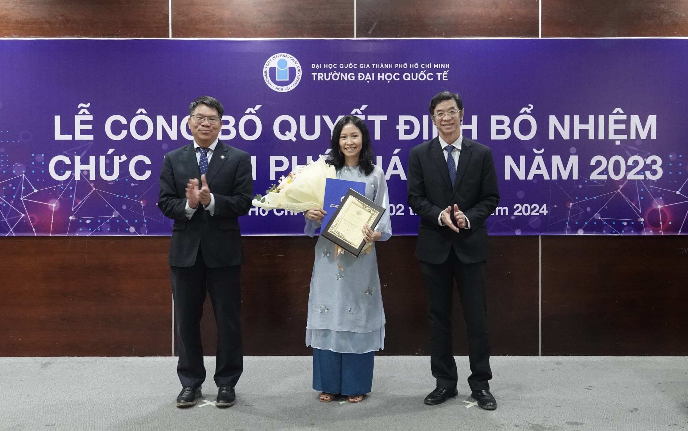PGS. TS. Lê Văn Thăng – Hiệu trưởng trường ĐHQT – và TS. Hồ Nhựt Quang – Bí thư Đảng ủy, Chủ tịch Hội đồng trường – trao quyết định bổ nhiệm cho PGS. TS. Nguyễn Thảo Trang – Giảng viên Khoa Kỹ thuật Hoá học và Môi trường.