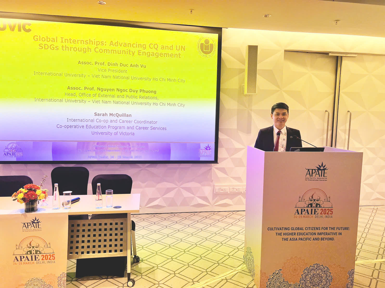 PGS.TS. Nguyễn Ngọc Duy Phương – Trưởng phòng Phòng Quan hệ Đối ngoại – trình bày bài tham luận có chủ đề “Global Internships: Advancing Cultural Intelligence (CQ) and UN SDGs through Community Engagement” (tạm dịch: “Thực tập toàn cầu: Nâng cao Trí tuệ Văn hóa và Mục tiêu Phát triển Bền vững của Liên Hợp Quốc thông qua Gắn kết Cộng đồng)