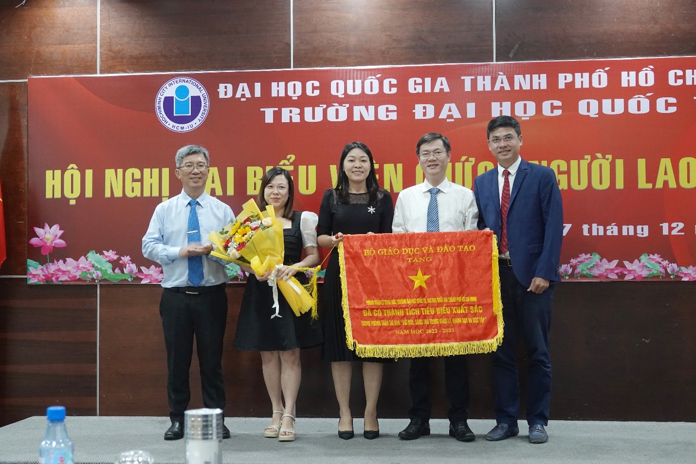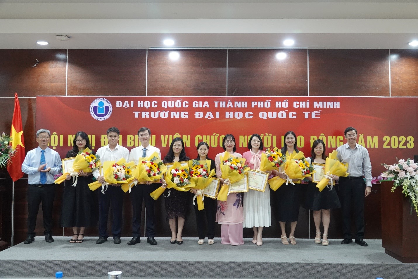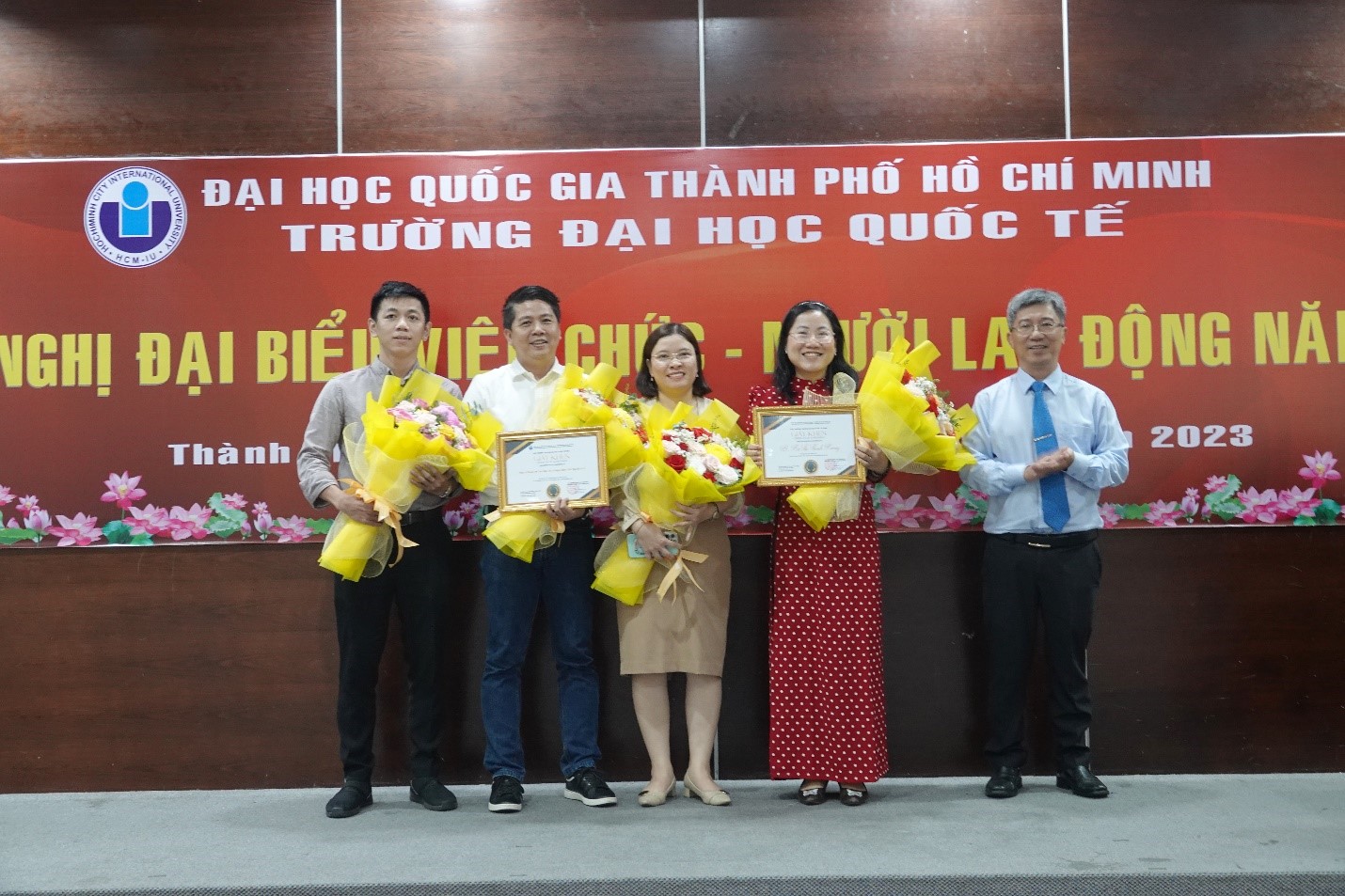 Các cá nhân đạt danh hiệu Lao động xuất sắc năm học 2022 – 2023 nhận hoa và giấy khen của Bộ trưởng Bộ Hm88nhacai tỷ lệ kèo WC 2026 và Đào tạo từ PGS.TS. Đinh Đức Anh Vũ – Phó Hiệu trưởng Phụ trách trường ĐHQT – và TS. Hồ Nhựt Quang – Bí thư Đảng uỷ, Chủ tịch Hội đồng trường ĐHQT.
