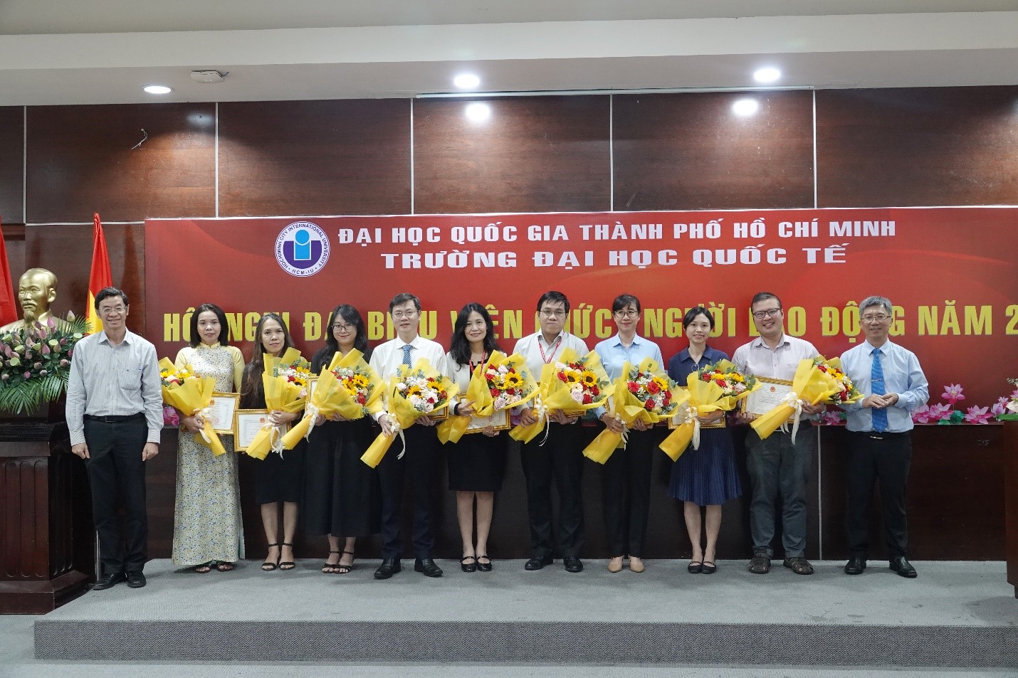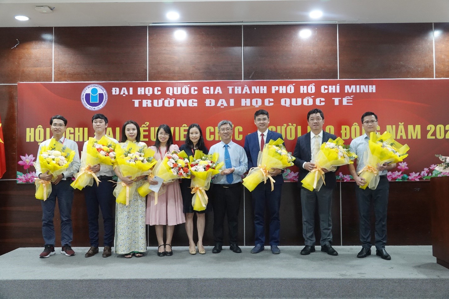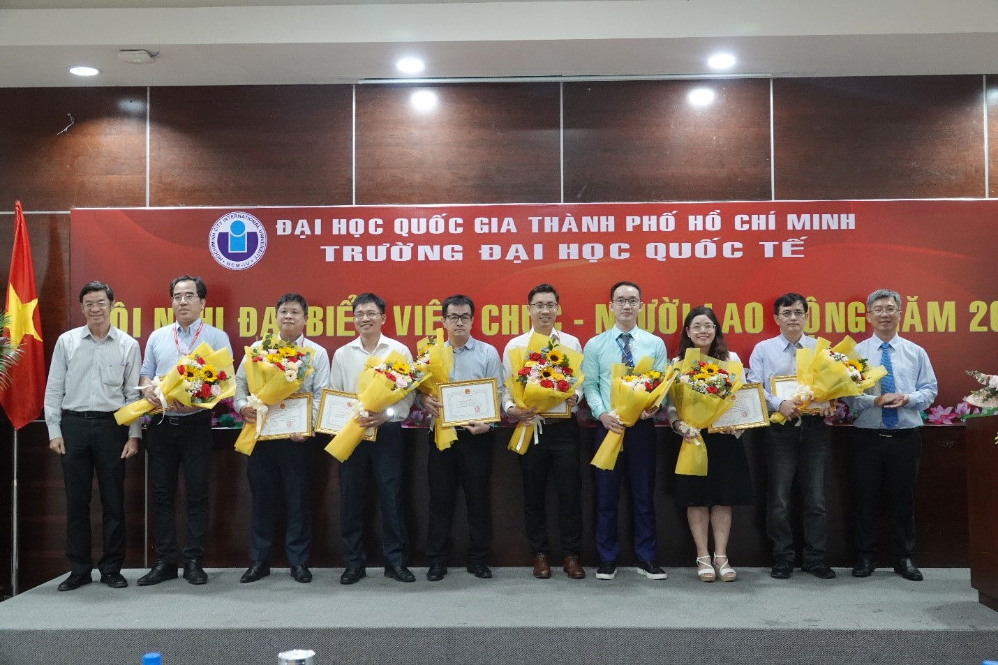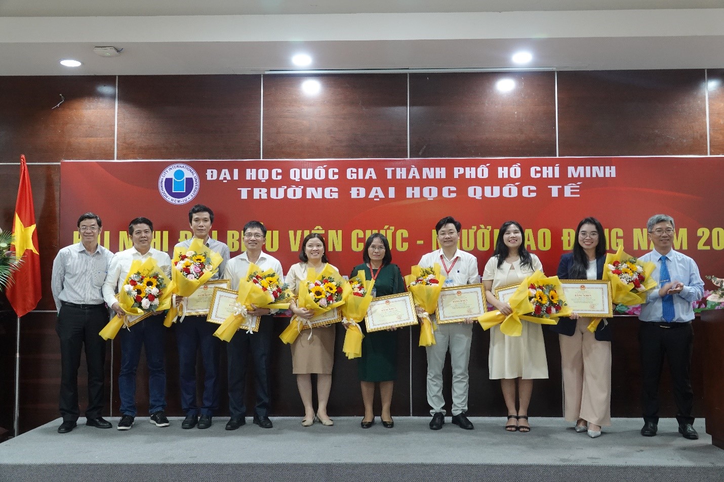 Các cá nhân đạt danh hiệu Lao động xuất sắc năm học 2022 – 2023 nhận hoa và giấy khen của Bộ trưởng Bộ Hm88nhacai tỷ lệ kèo WC 2026 và Đào tạo từ PGS.TS. Đinh Đức Anh Vũ – Phó Hiệu trưởng Phụ trách trường ĐHQT – và TS. Hồ Nhựt Quang – Bí thư Đảng uỷ, Chủ tịch Hội đồng trường ĐHQT.