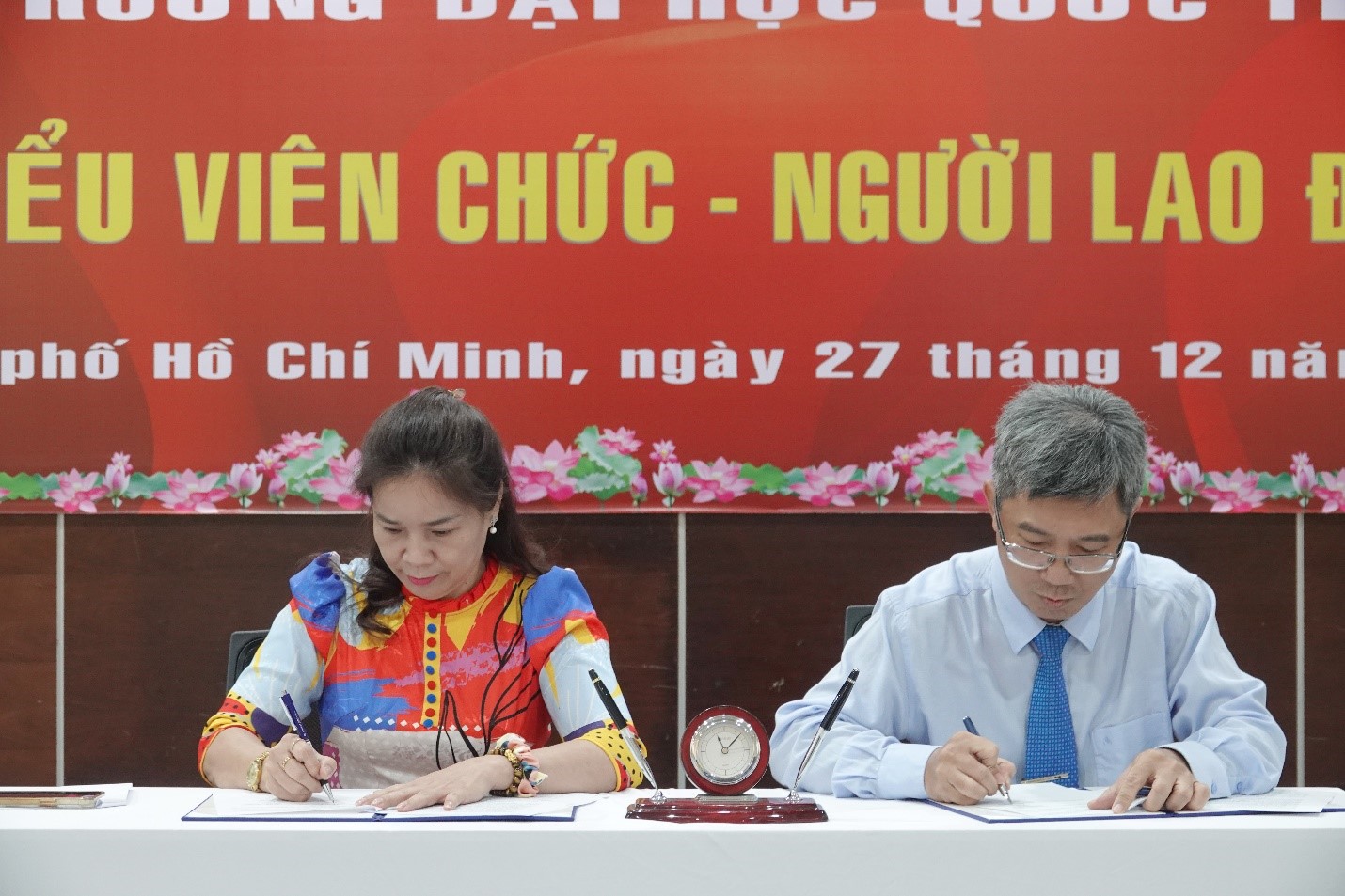 Hội nghị cũng chứng kiến giây phút PGS.TS. Đinh Đức Anh Vũ – Phó Hiệu trưởng Phụ trách trường ĐHQT – và ThS. Trần Thị Thanh Lịch – Chủ tịch Công đoàn trường ĐHQT – cùng nhau ký Quy chế Phối hợp giữa chính quyền và công đoàn.