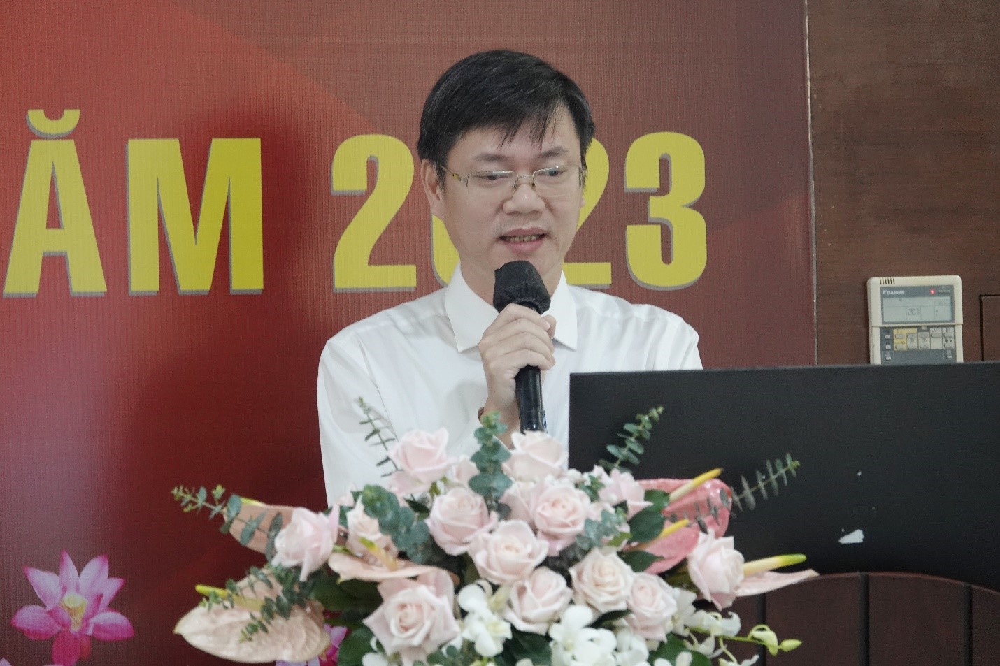 PGS.TS. Đinh Đức Anh Vũ – Phó Hiệu trưởng Phụ trách Trường ĐHQT – báo cáo hoạt động của nhà trường năm học 2022 – 2023 và phương hướng hoạt động năm học 2023 – 2024.