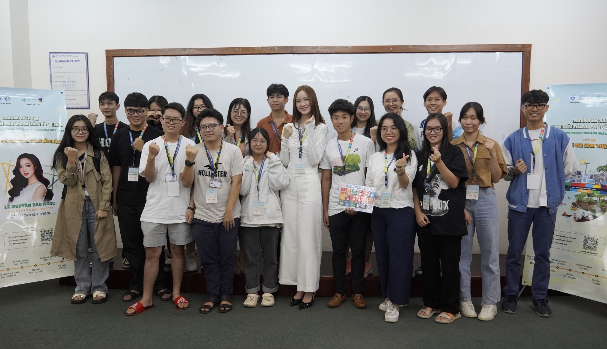 Hoa hậu Liên Lục Địa 2022 – Lê Nguyễn Bảo Ngọc chụp ảnh lưu niệm cùng các đội thi và ban tổ chức trong buổi tập huấn Thanh niên tích cực.