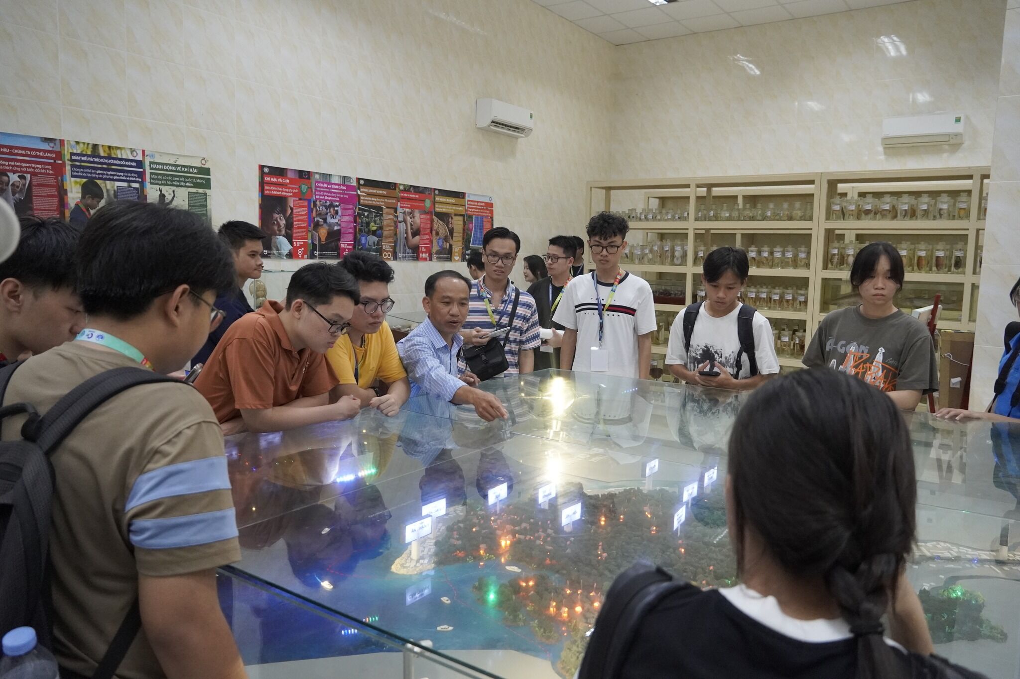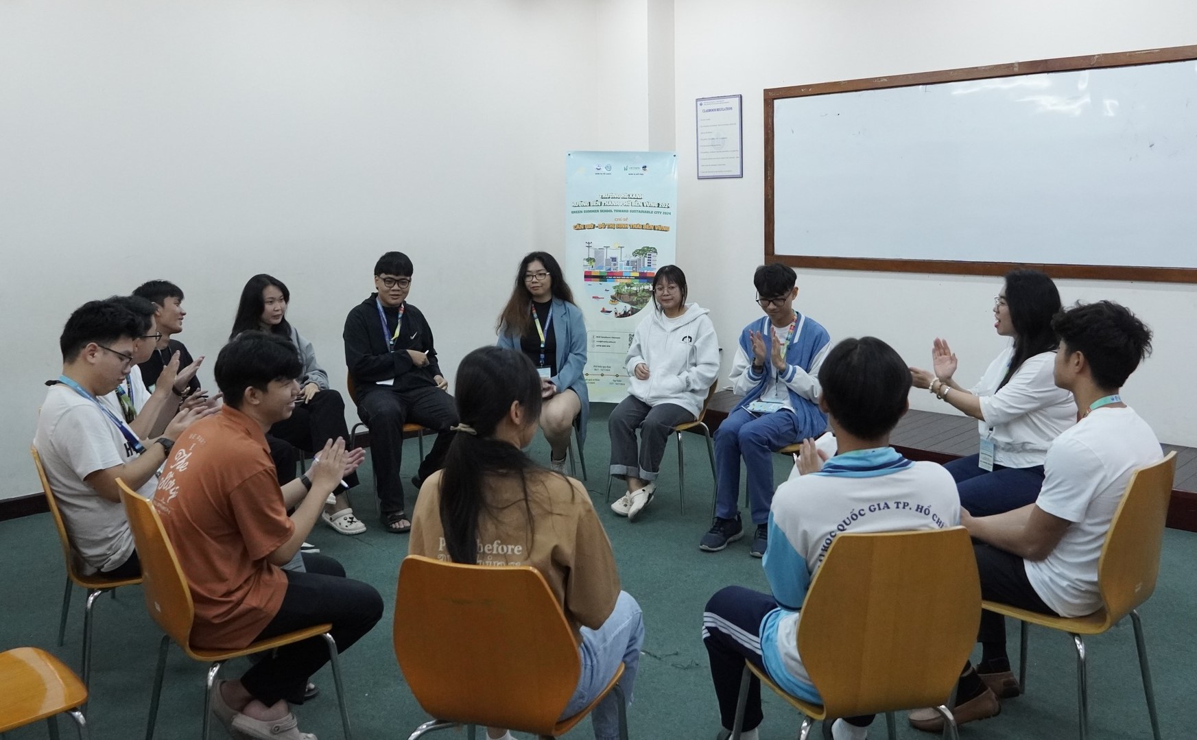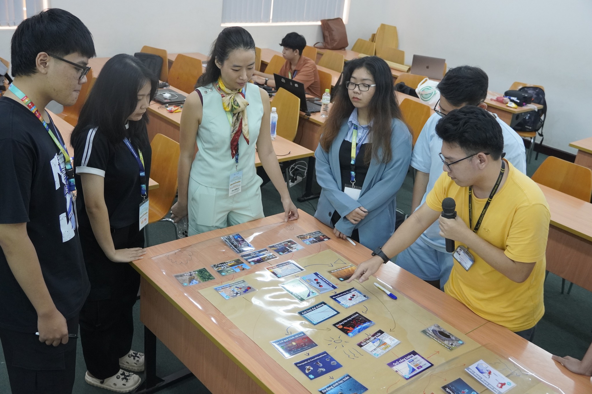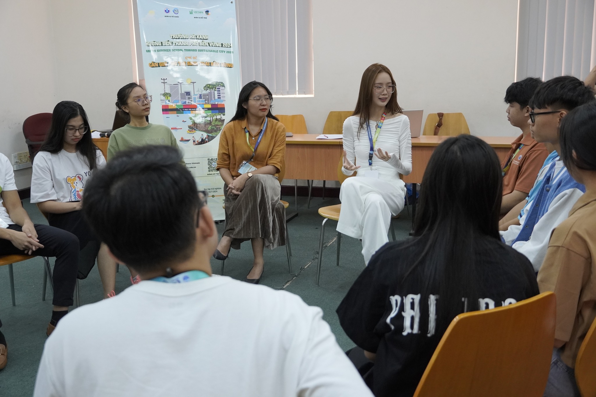 Hoa hậu Bảo Ngọc cùng các đội thi thảo luận về chủ đề thanh niên hành động vì khí hậu trong buổi tập huấn Thanh niên tích cực.