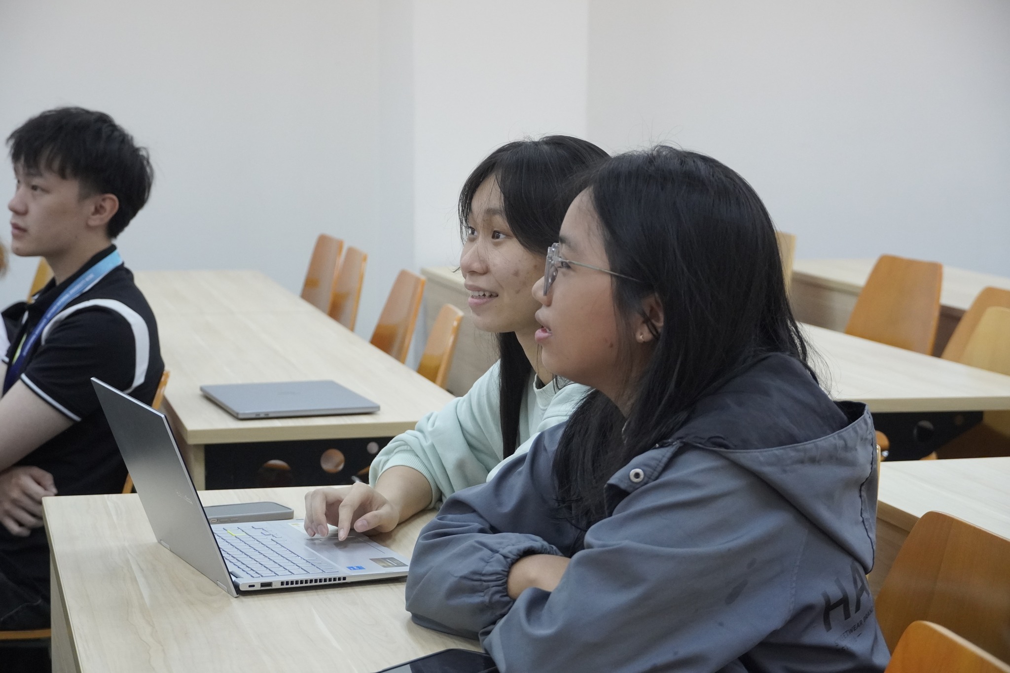 Hai em Nguyễn Khả Doanh và Nguyễn Phương Vy – học sinh Trường THPT Linh Trung hào hứng tham gia cùng tập huấn viên Trong buổi tập huấn Đô thị và Hạ tầng Xanh.