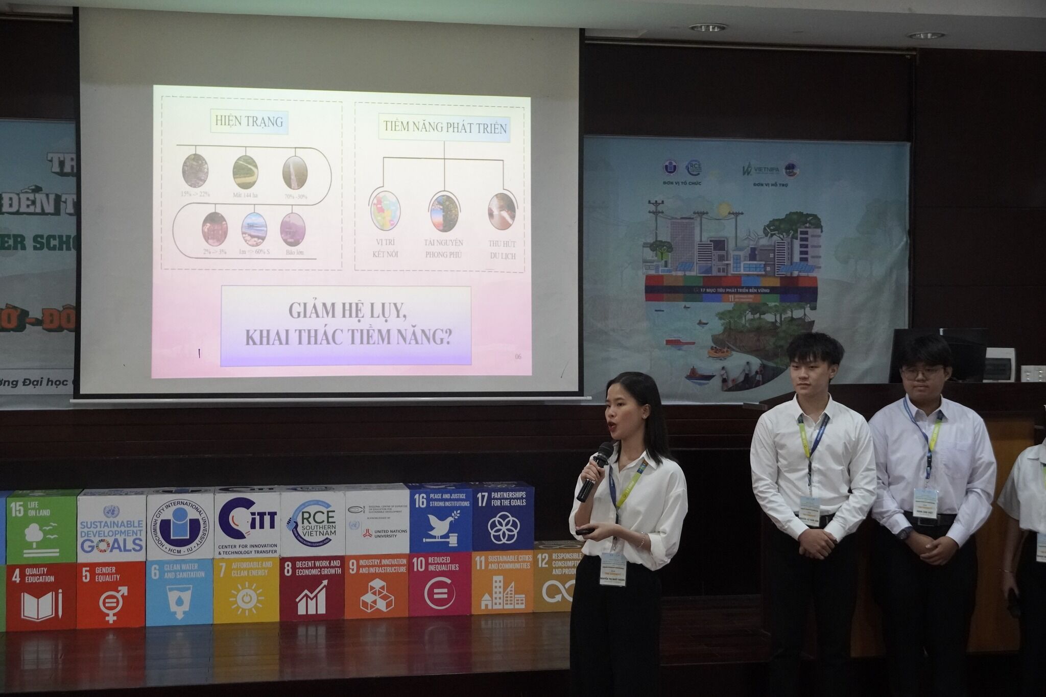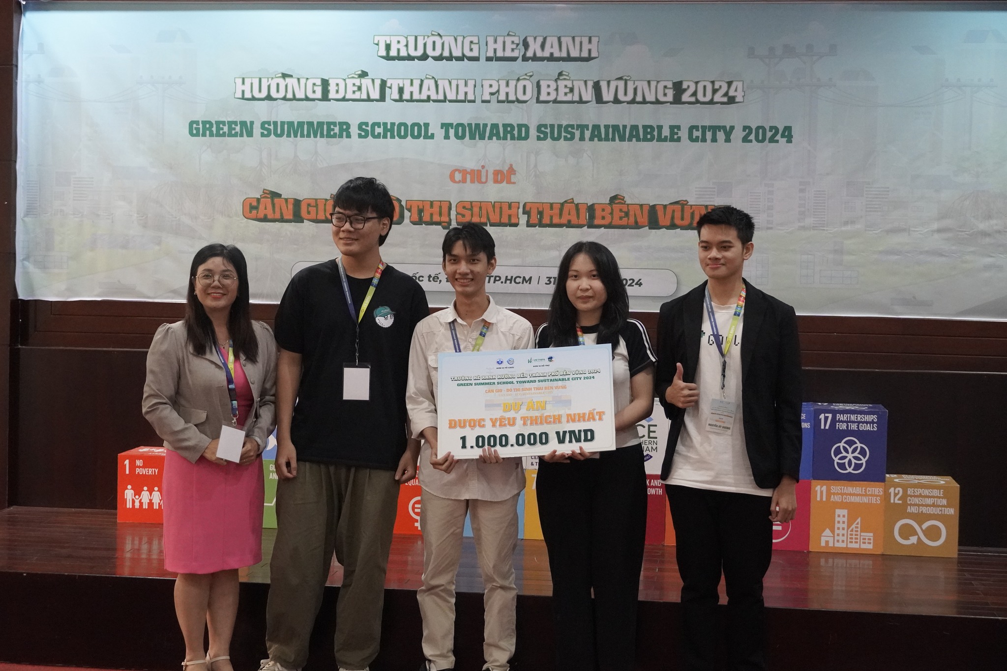 Đội GSS2302 với các thành viên đến từ Khoa Kỹ thuật và Quản lý Xây dựng, Trường Hm88 nhacai cá cược thể thao Quốc tế, Trường ĐH Giao thông Vận tải TP.HCM, Trường Phổ thông Năng khiếu và Trường THPT Nguyễn Hữu Huân trình bày đề xuất dự án.